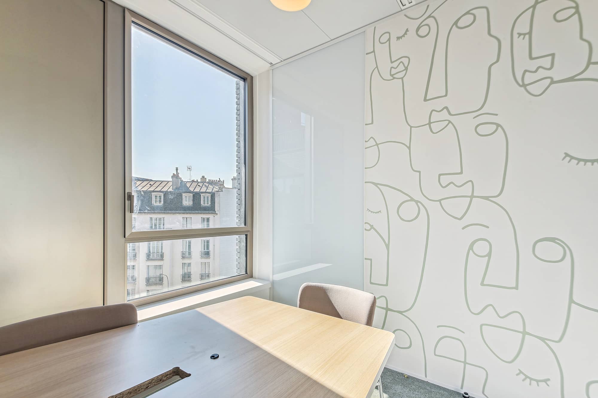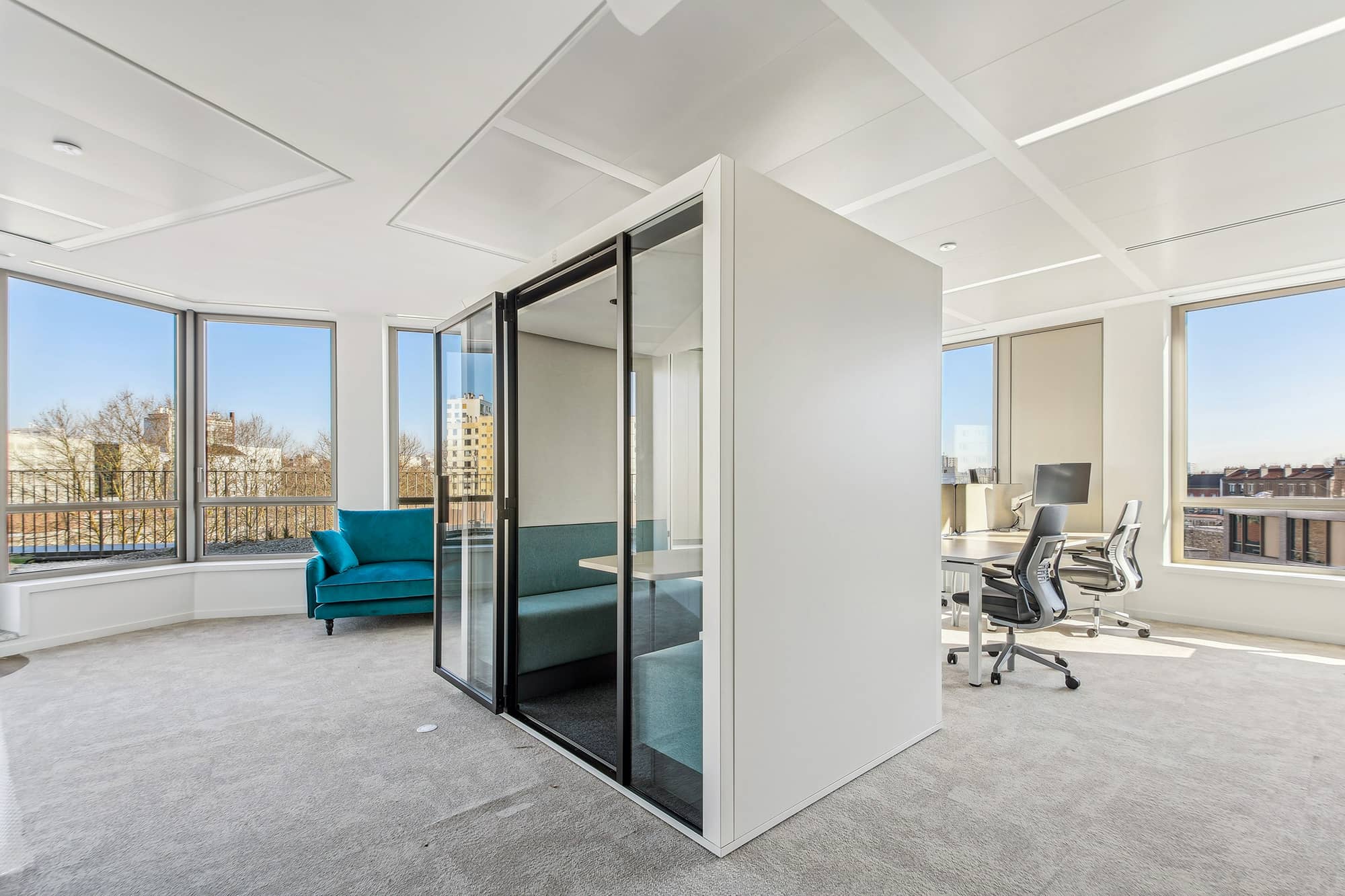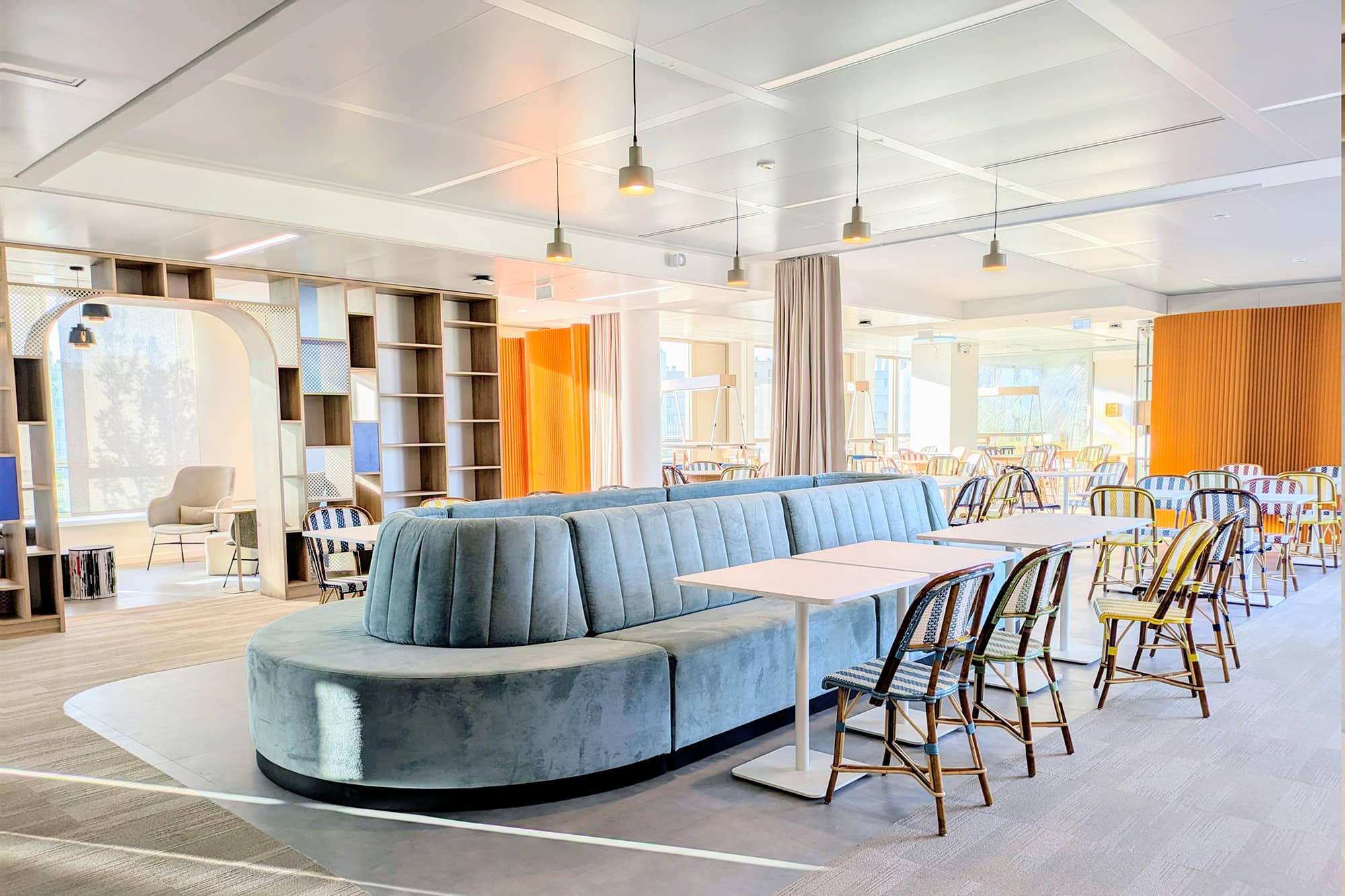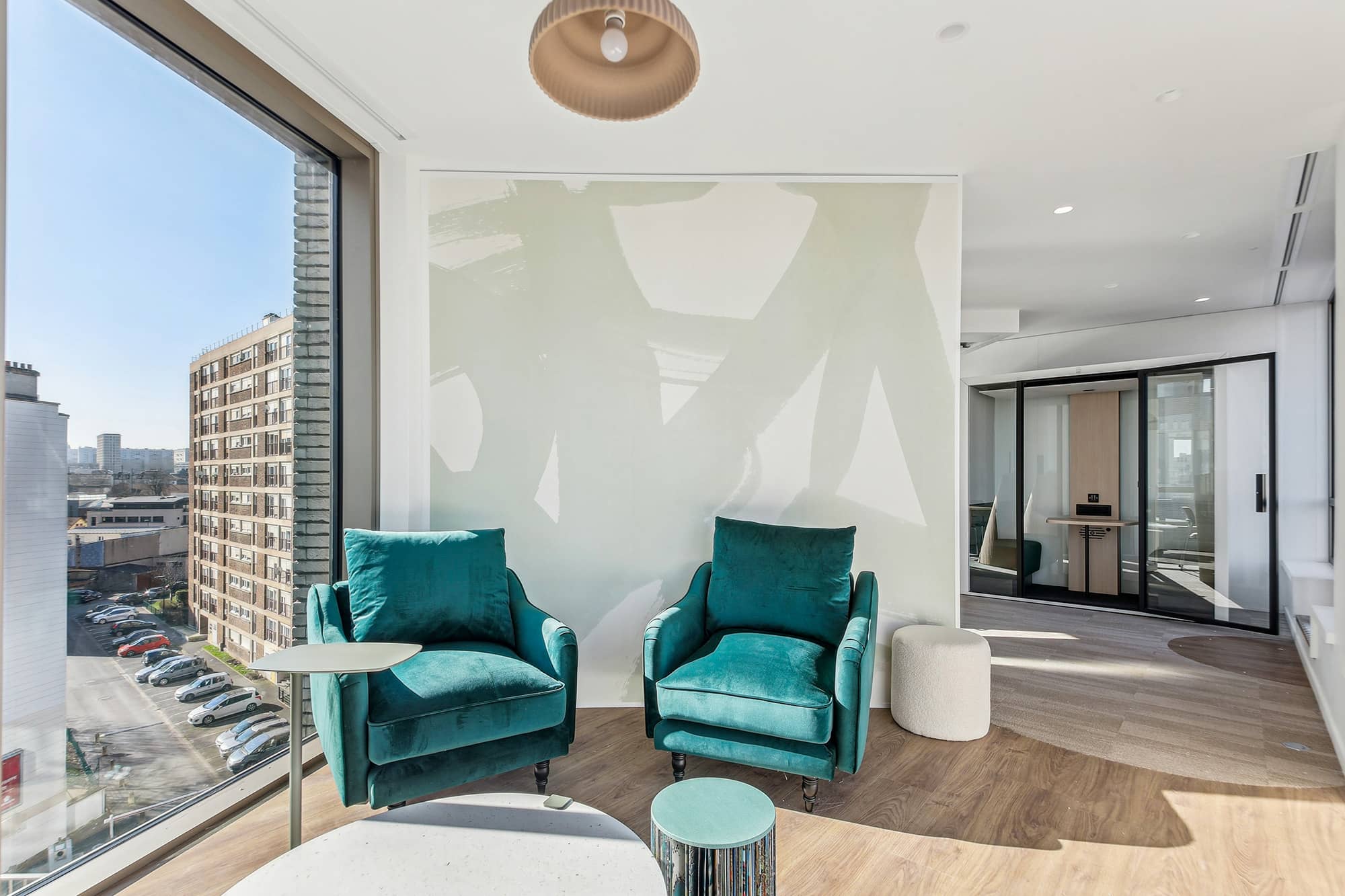Pour apporter une note plus contemporaine, les espaces sont ponctués avec des plans de travail en résine effet pierre, des éléments métalliques ponctuels en tôle perforée bleue ou beige. L’ambiance des espaces est chaleureuse et moderne. Chaque entité du groupe a pu choisir ses papiers peints, ses peintures et ses luminaires. Cette décision permet de faciliter l’appropriation des espaces par les équipes. Cette réalisation s’ajoute à la liste des projets d’exception de Parella. L’agence a su répondre à toutes les attentes de son client.
