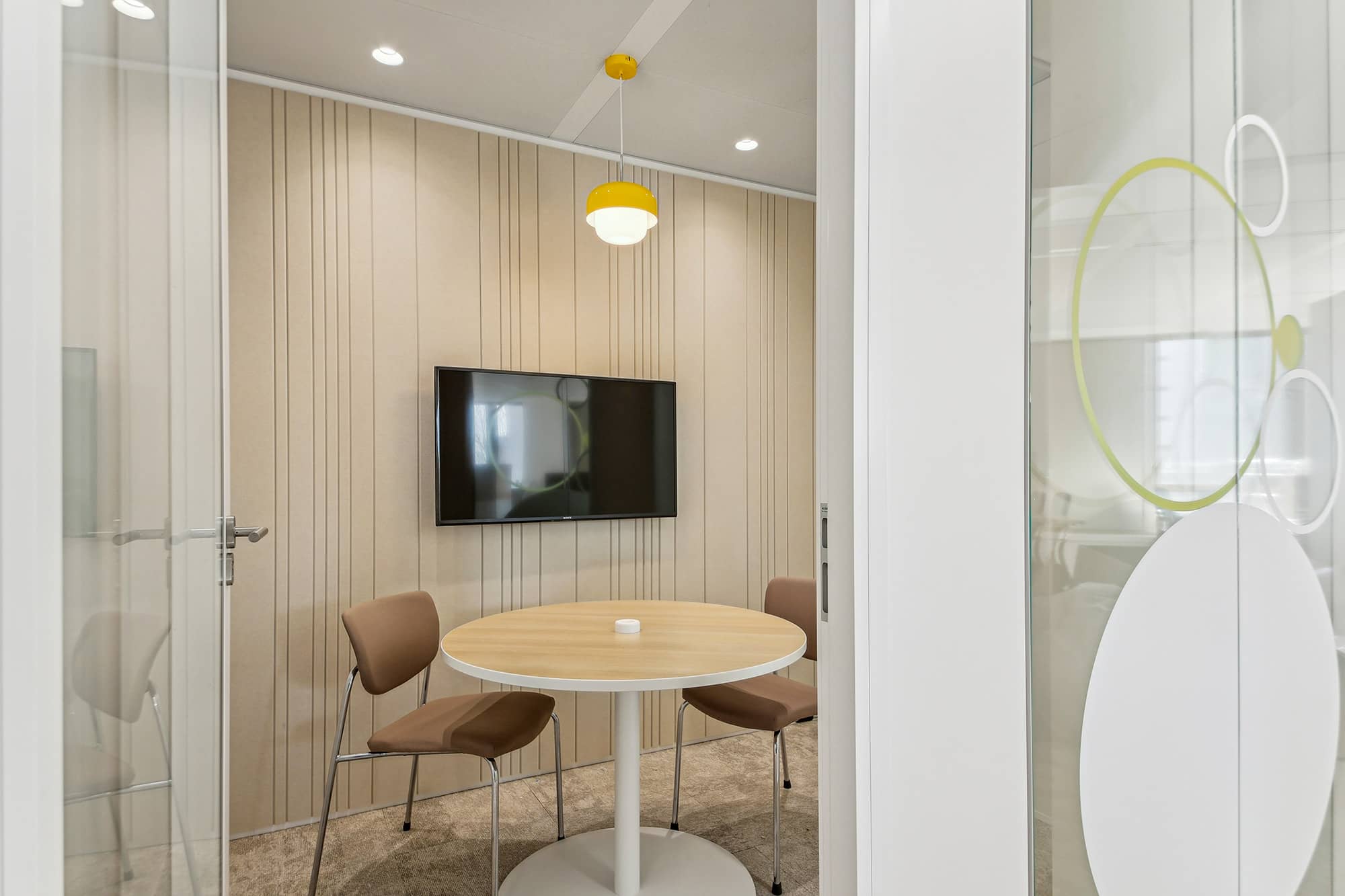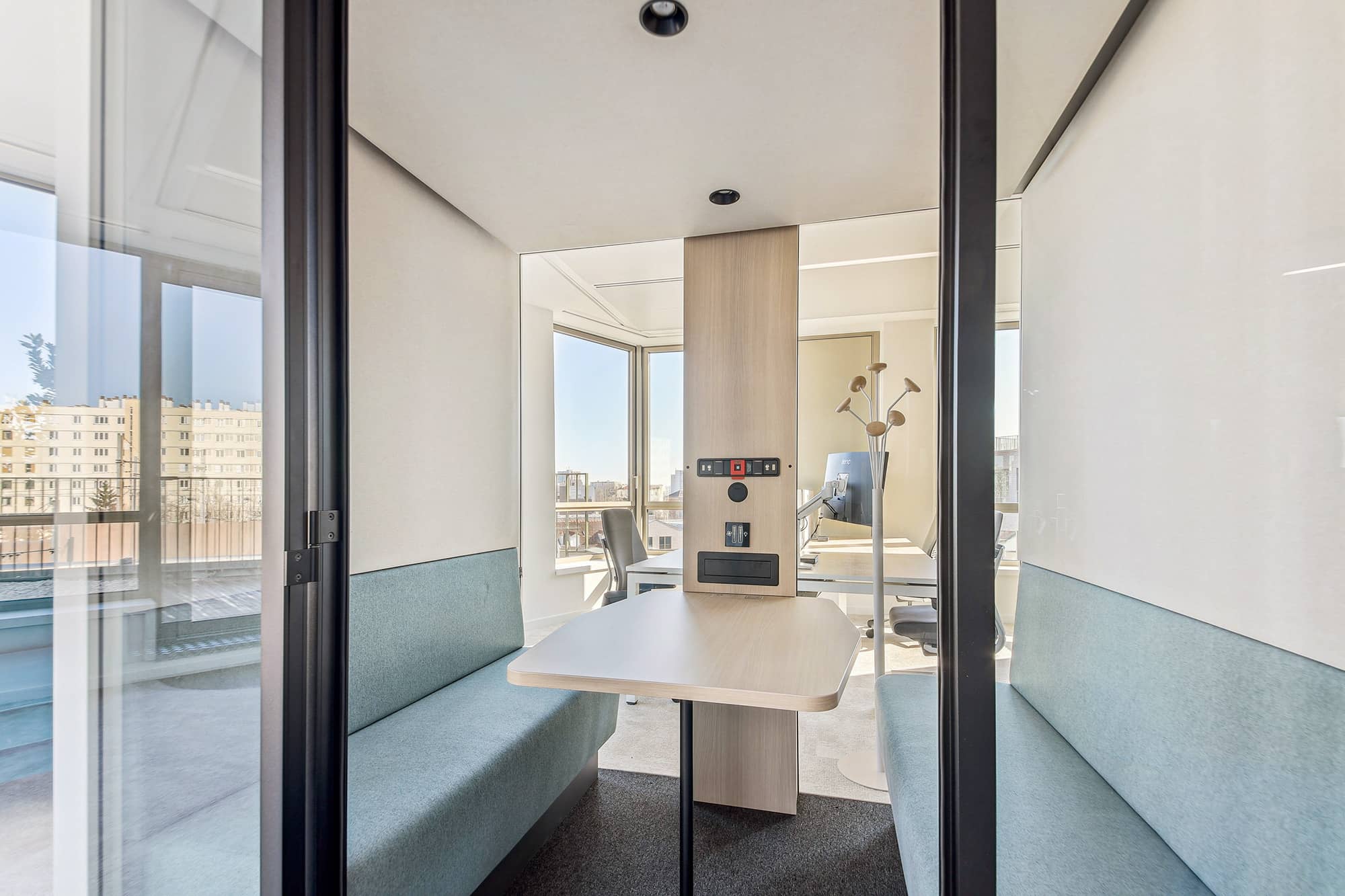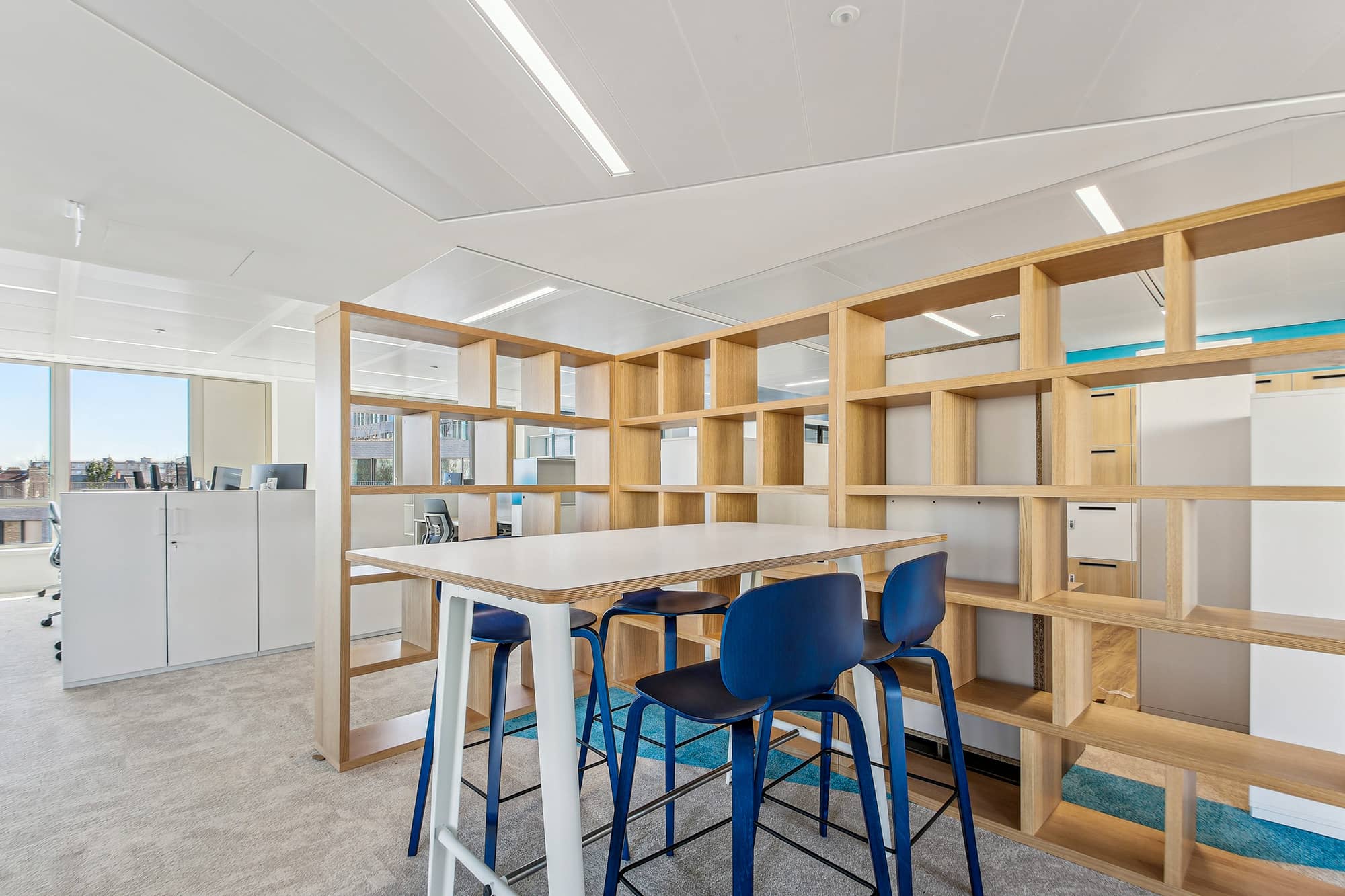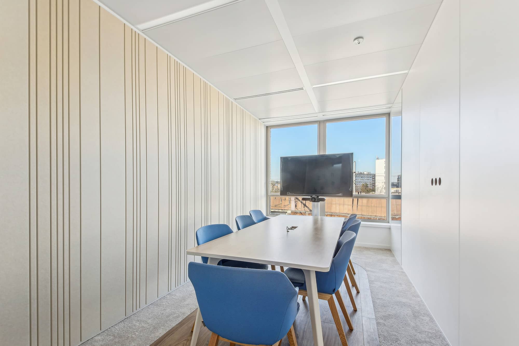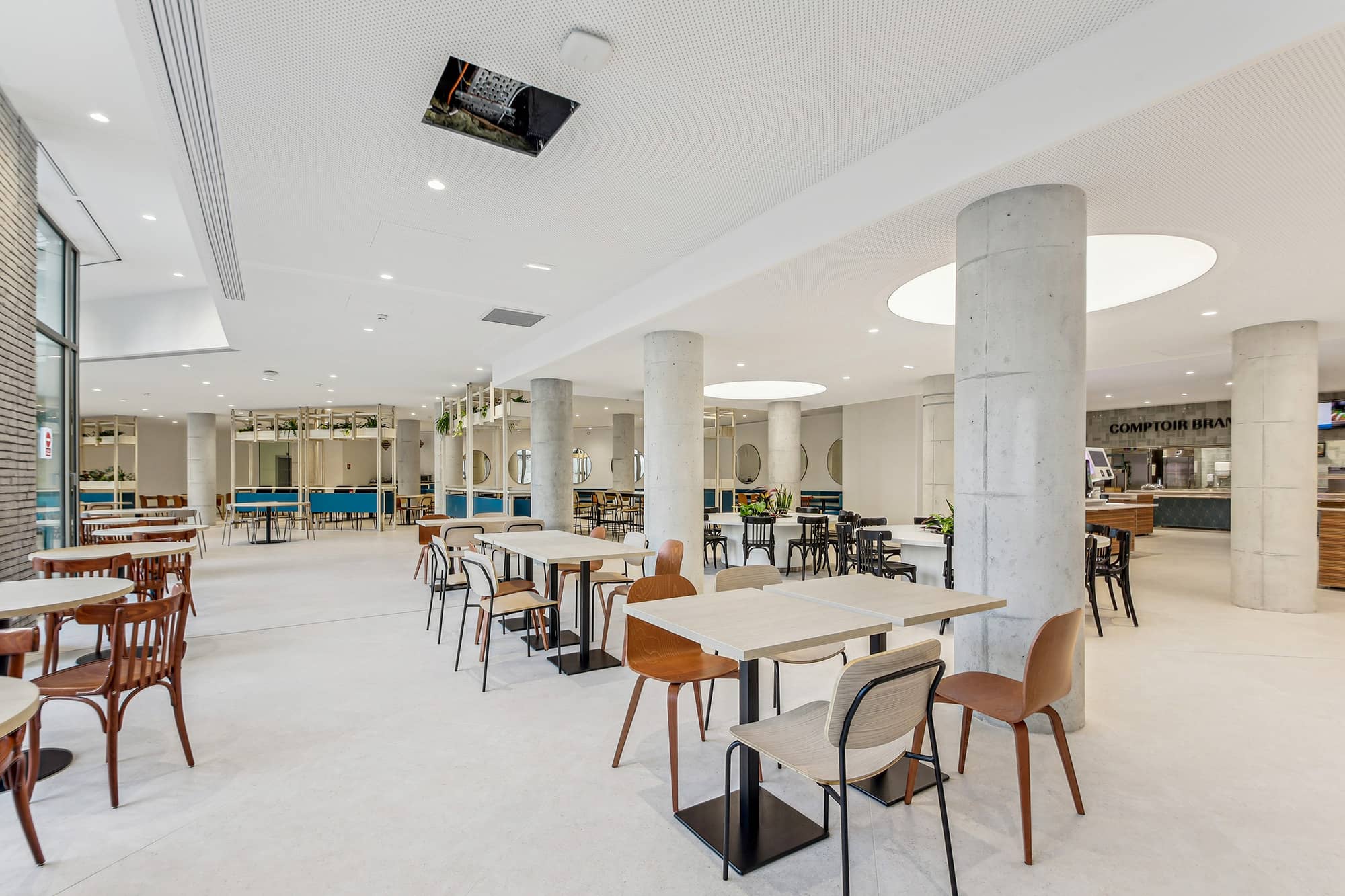 Pour apporter une note plus contemporaine, les espaces sont ponctués avec des plans de travail en résine effet pierre, des éléments métalliques ponctuels en tôle perforée bleue ou beige. L’ambiance des espaces est chaleureuse et moderne. Chaque entité du groupe a pu choisir ses papiers peints, ses peintures et ses luminaires. Cette décision permet de faciliter l’appropriation des espaces par les équipes. Cette réalisation s’ajoute à la liste des projets d’exception de Parella. L’agence a su répondre à toutes les attentes de son client.