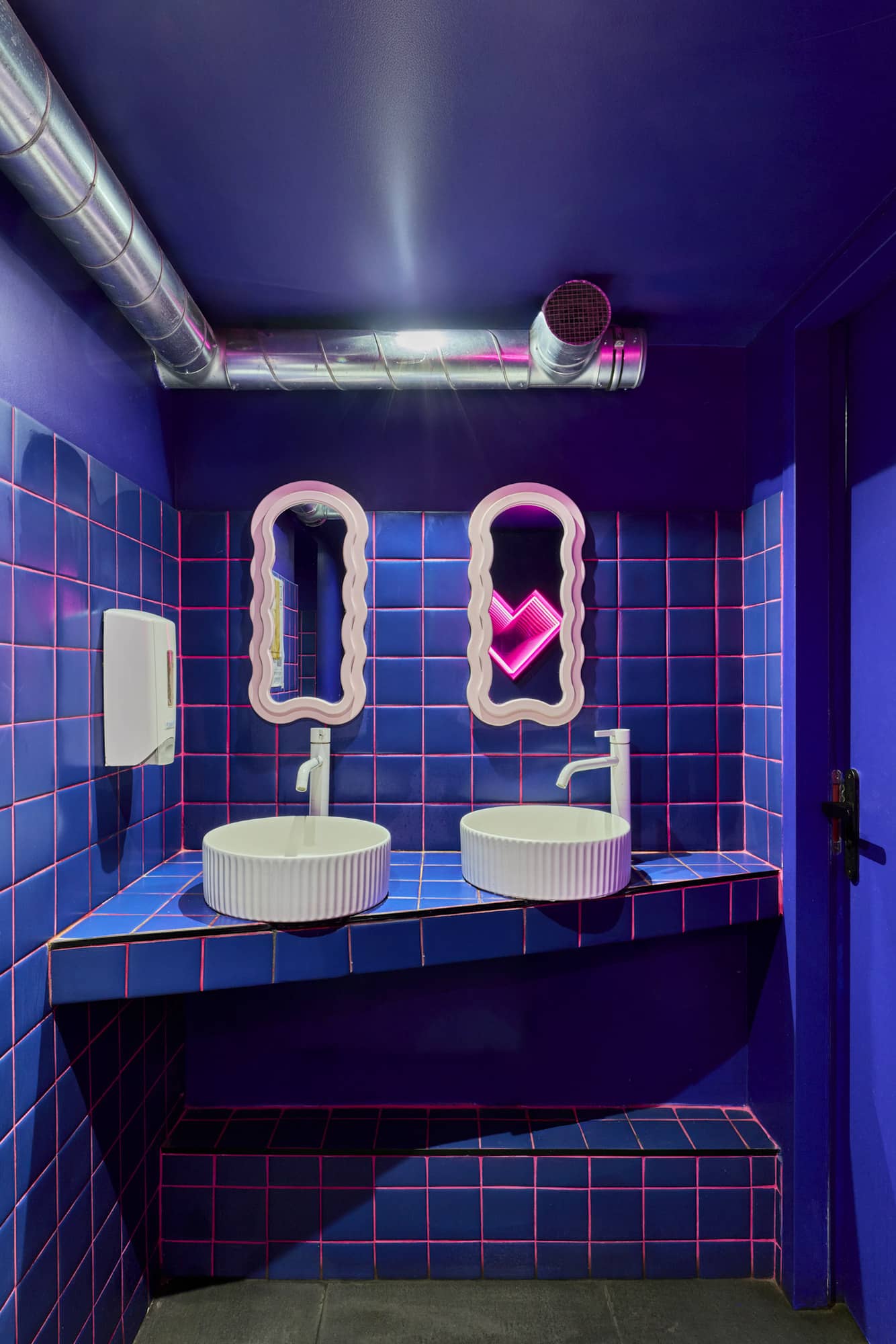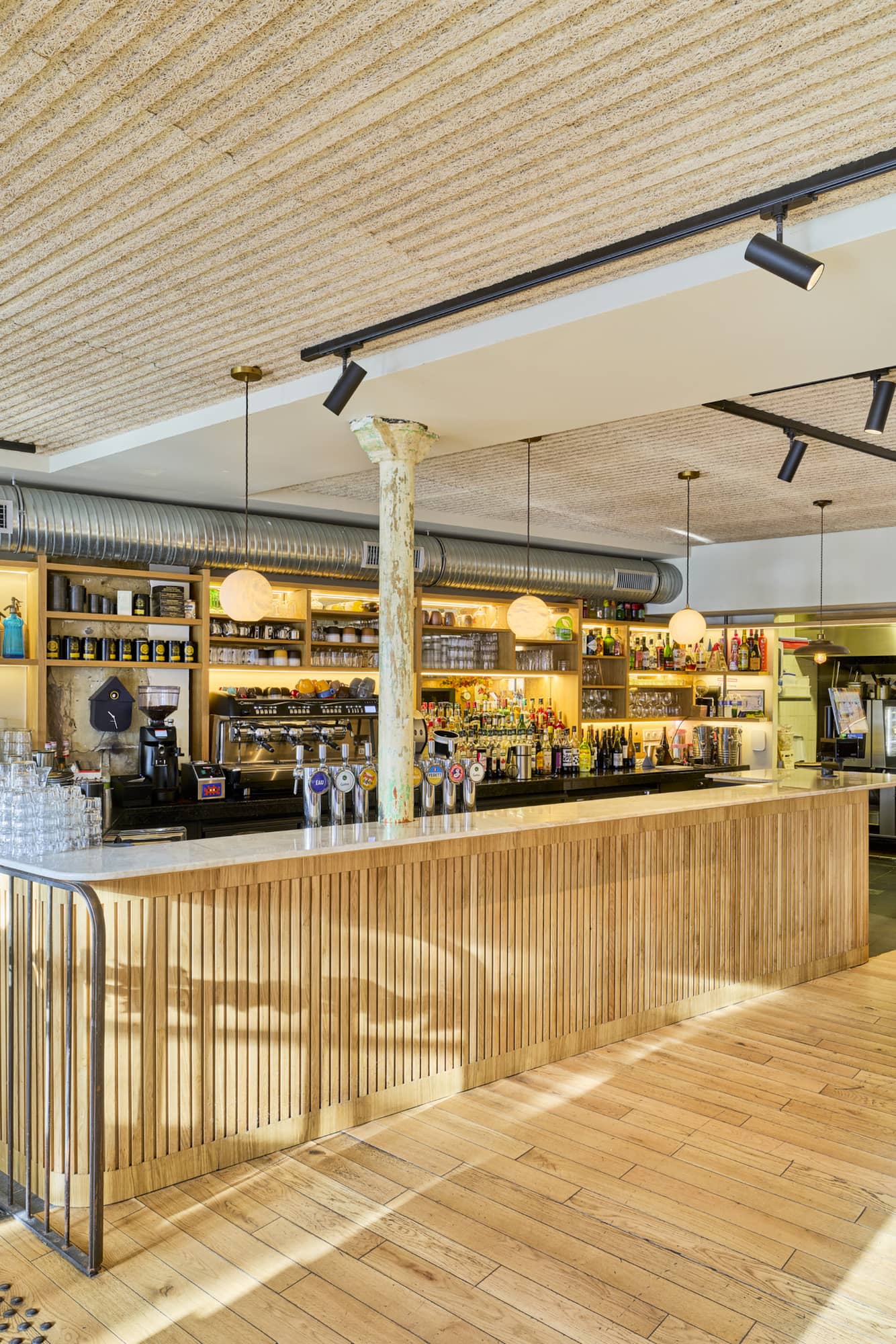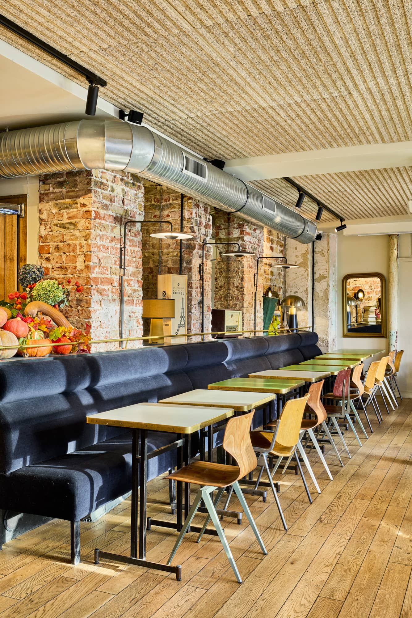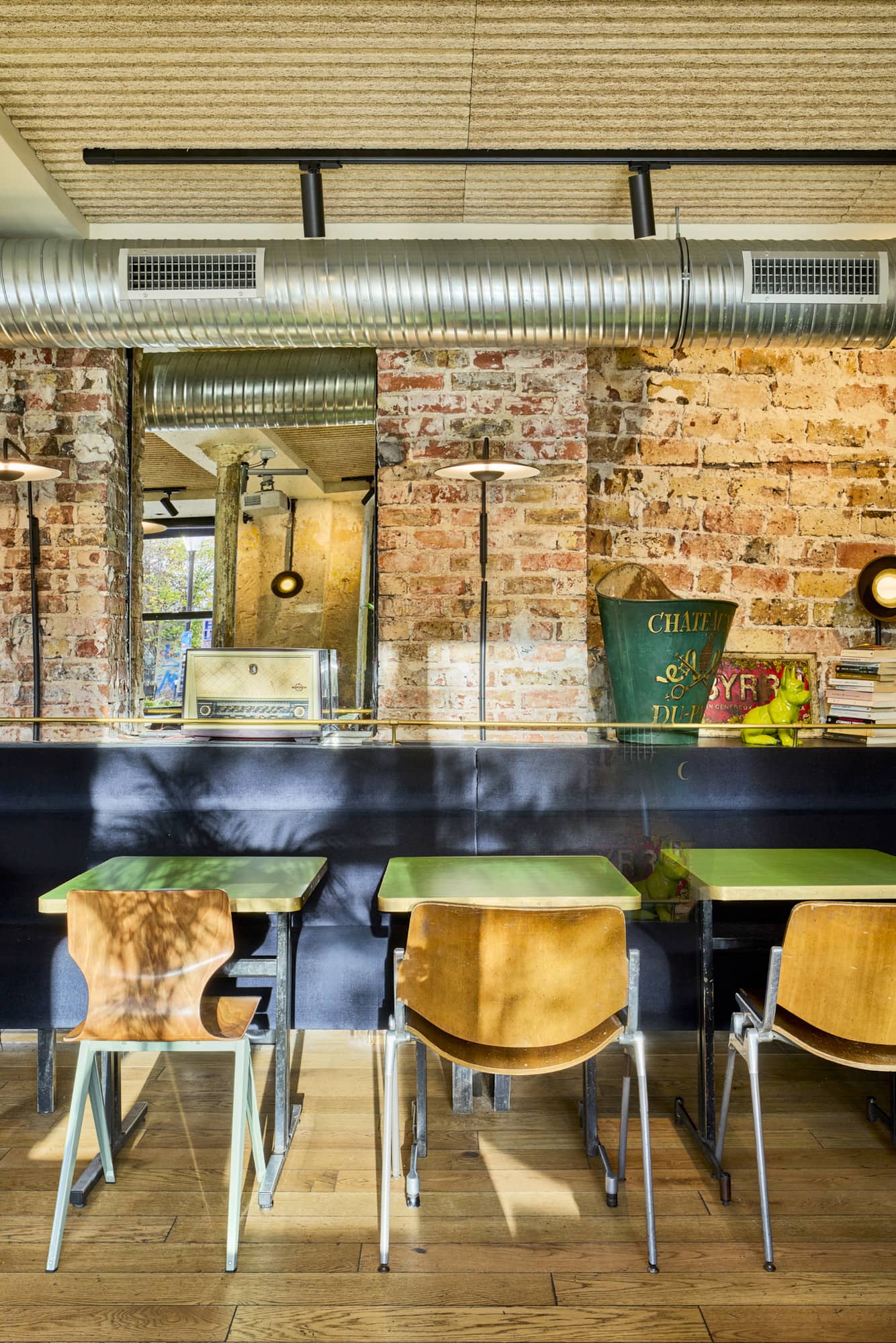 Pendant plus de trois mois, Sowen, l’agence spécialisée dans la création de lieux chargés d’expériences, a transformé l’intérieur : cuisine, bar, salle de repas, sanitaires et façade ont été réinventés. Pour ce faire, le groupe a choisi de mettre en lumière le caractère brut de l’existant. Ainsi, les murs de briques, les poutres métalliques, et les cicatrices d’un passé artisanal sont désormais devenus des témoins de l’authenticité retrouvée. À l’entrée, un discret présentoir à desserts achève l’agencement fonctionnel. La banquette, redessinée par Stark, a retrouvé son confort d’antan, tandis qu’une lumière douce et évolutive danse au fil des heures. Les suspensions en albâtre et les appliques en métal créent de subtils reflets, établissant une ambiance chaleureuse, presque espiègle. Par ailleurs, le bar, cœur battant du projet, a été redessiné et agrandi pour accueillir les convives. Son comptoir en marbre Spadaccini, ondulant avec élégance, invite à se poser. Les sanitaires, avec leur carrelage bleu Klein rehaussé de joints rose fluo, offrent un contraste saisissant, rendant cet espace monochrome aussi inattendu que photogénique. Ce bleu, clin d’œil à la façade du bistrot, évoque la célèbre Fontaine Wallace, voisine bien-aimée. Dans une démarche respectueuse, Sowen a réutilisé et optimisé chaque élément, sans recourir à du mobilier neuf. L’agence a privilégié la restauration à la simple substitution ainsi que la valorisation à la dissimulation.
