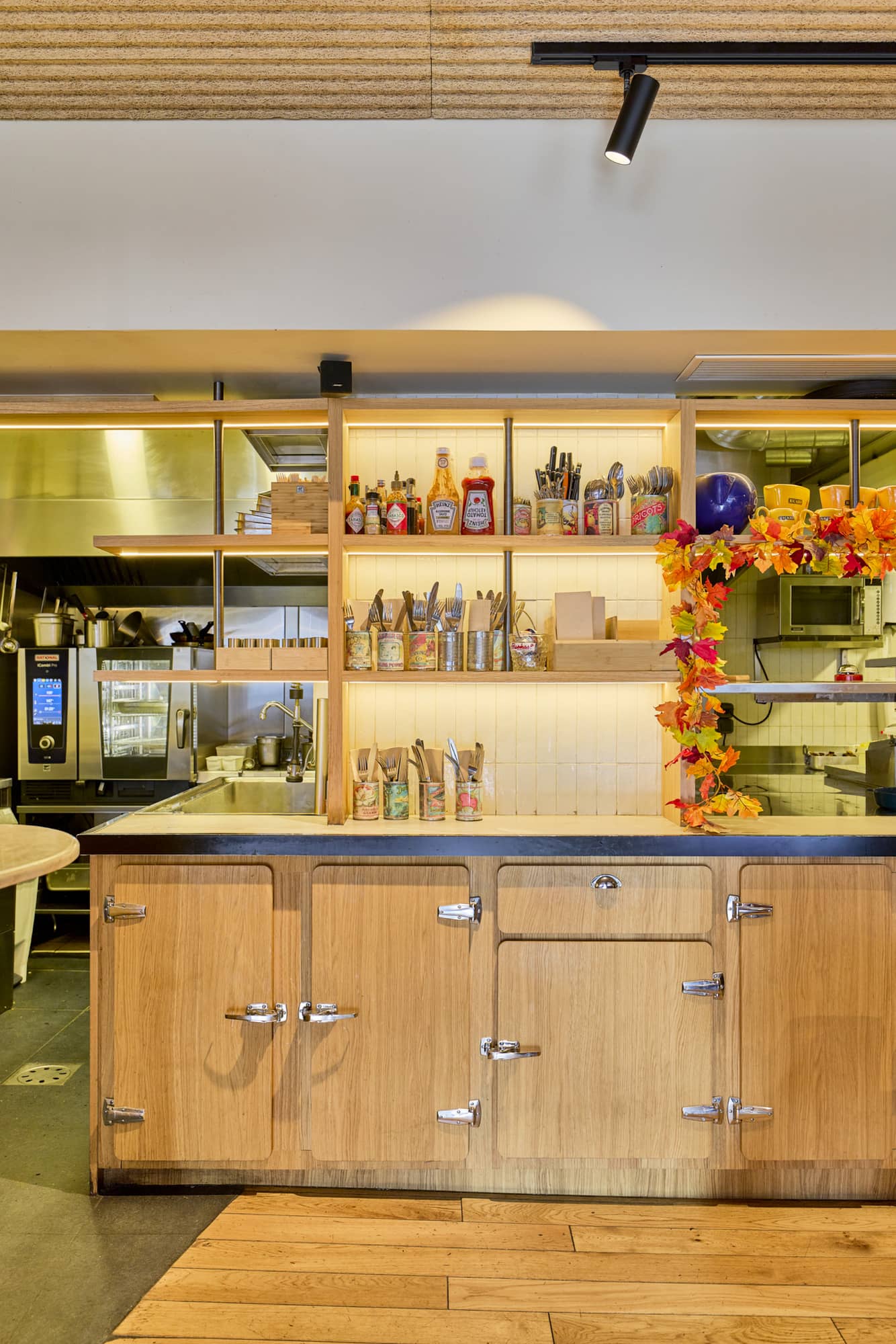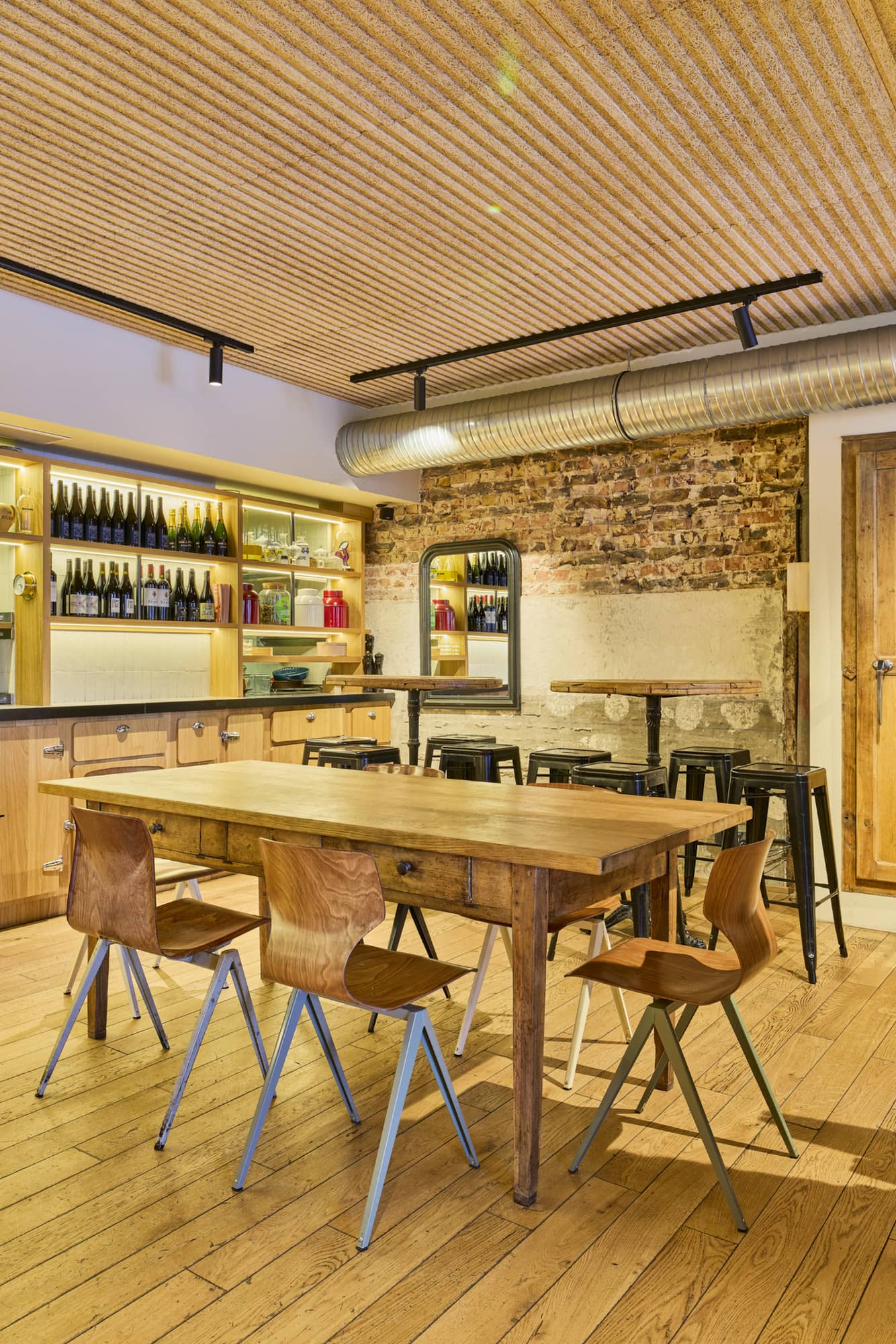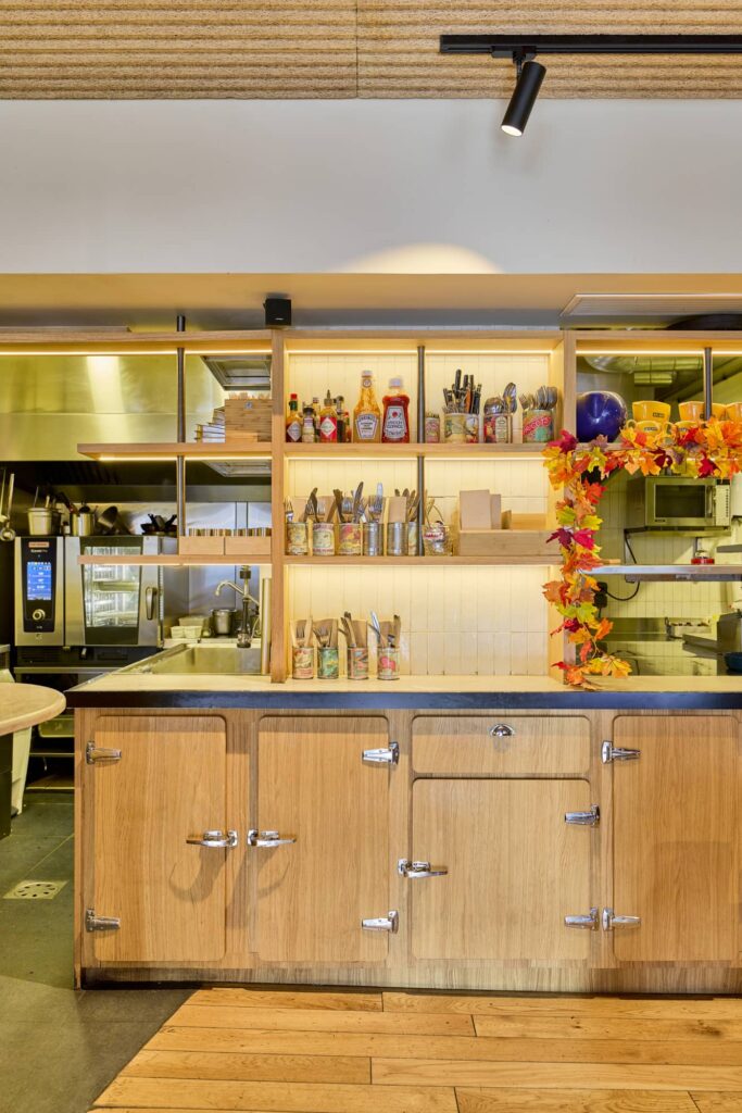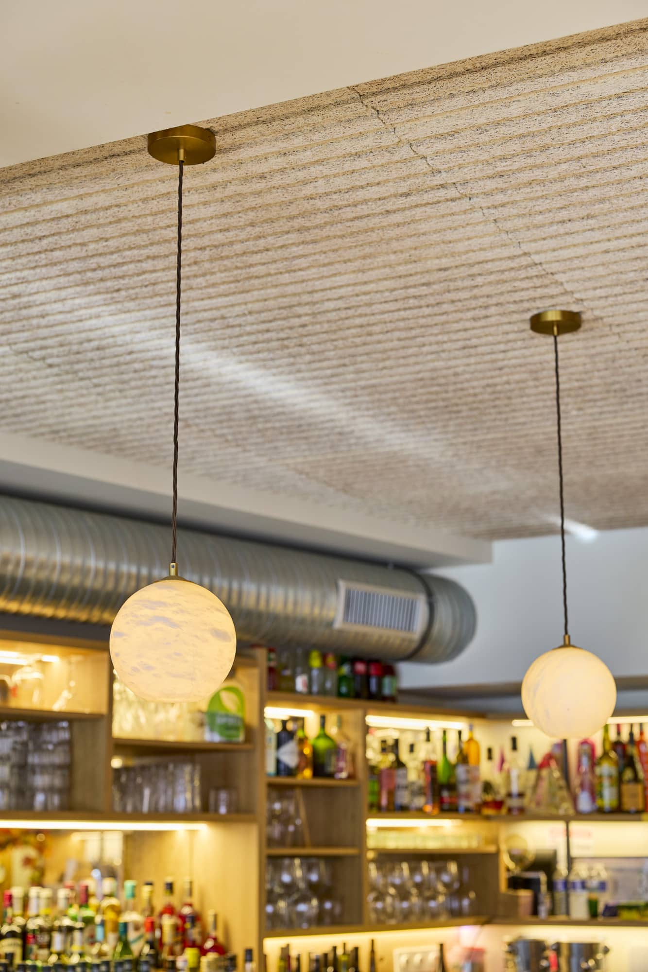 Pendant plus de trois mois, Sowen, l’agence spécialisée dans la création de lieux chargés d’expériences, a transformé l’intérieur : cuisine, bar, salle de repas, sanitaires et façade ont été réinventés. Pour ce faire, le groupe a choisi de mettre en lumière le caractère brut de l’existant. Ainsi, les murs de briques, les poutres métalliques, et les cicatrices d’un passé artisanal sont désormais devenus des témoins de l’authenticité retrouvée. À l’entrée, un discret présentoir à desserts achève l’agencement fonctionnel. La banquette, redessinée par Stark, a retrouvé son confort d’antan, tandis qu’une lumière douce et évolutive danse au fil des heures. Les suspensions en albâtre et les appliques en métal créent de subtils reflets, établissant une ambiance chaleureuse, presque espiègle. Par ailleurs, le bar, cœur battant du projet, a été redessiné et agrandi pour accueillir les convives. Son comptoir en marbre Spadaccini, ondulant avec élégance, invite à se poser. Les sanitaires, avec leur carrelage bleu Klein rehaussé de joints rose fluo, offrent un contraste saisissant, rendant cet espace monochrome aussi inattendu que photogénique. Ce bleu, clin d’œil à la façade du bistrot, évoque la célèbre Fontaine Wallace, voisine bien-aimée. Dans une démarche respectueuse, Sowen a réutilisé et optimisé chaque élément, sans recourir à du mobilier neuf. L’agence a privilégié la restauration à la simple substitution ainsi que la valorisation à la dissimulation.