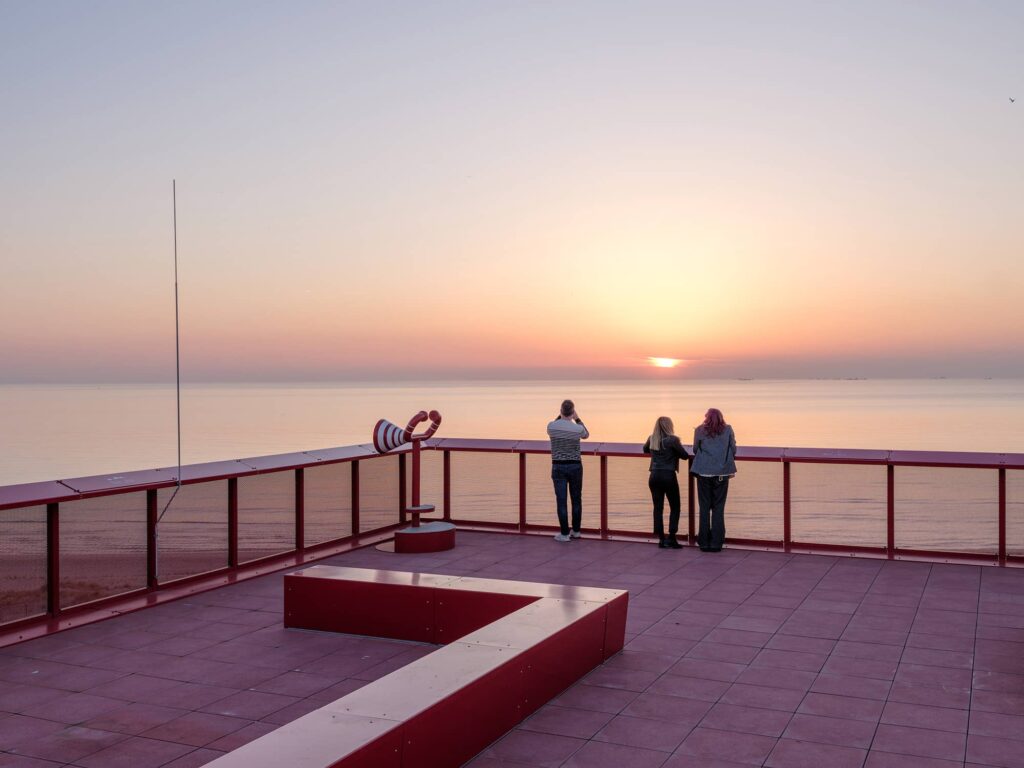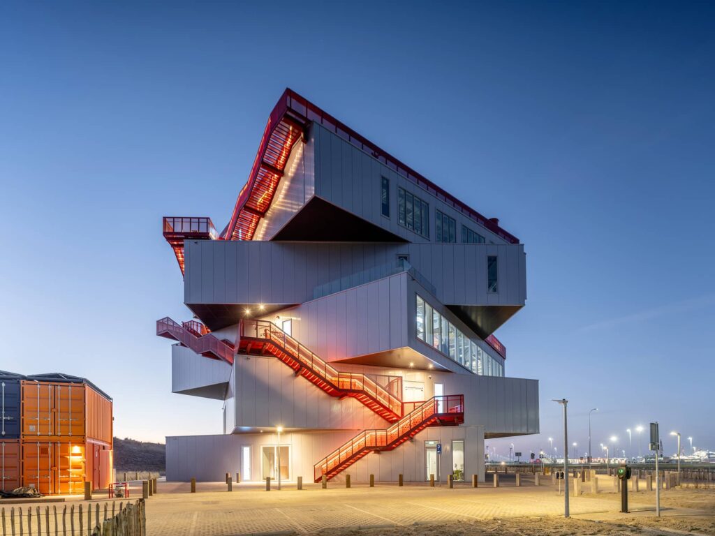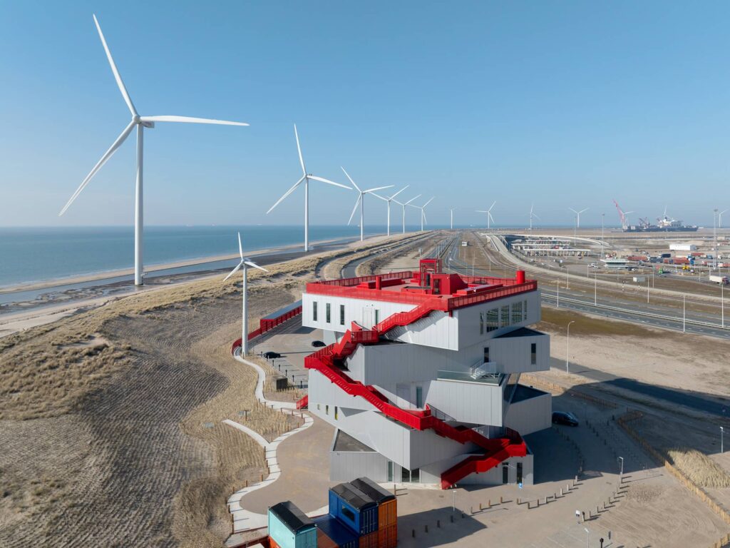 À 44 km à l’ouest du centre de Rotterdam, sur le terrain de la Maasvlakte 2 artificiellement gagné sur la mer, à l’extrémité occidentale du port, se dresse Portlantis. Dans ce paysage très caractéristique où se côtoient d’innombrables entrepôts, des grues, des paquebots et des containers, se tisse un décor spécifique encadré par une série d’éoliennes s’alignant en bord de mer. Entre séduction et étonnement le visiteur avance. Composée d’un empilement de cinq entités pivotant les unes sur les autres, la majestueuse structure et son ruban rouge écarlate galopant jusqu’au toit offre d’extraordinaires vues panoramiques sur le large, le littoral et le port. Livré en mars 2025, le projet, conçu par MVRDV, se veut être un centre d’accueil et un espace d’exposition entièrement dédié au port de Rotterdam, le plus grand port d’Europe.