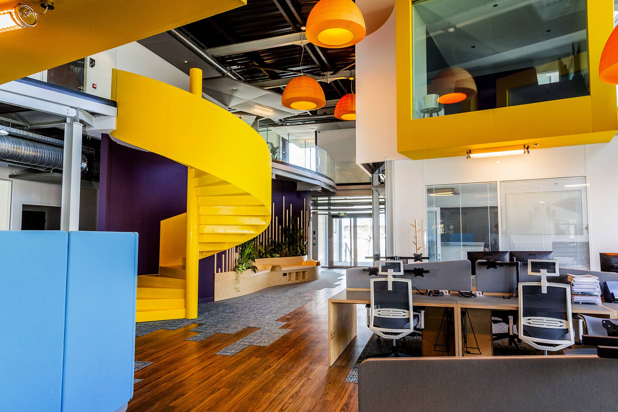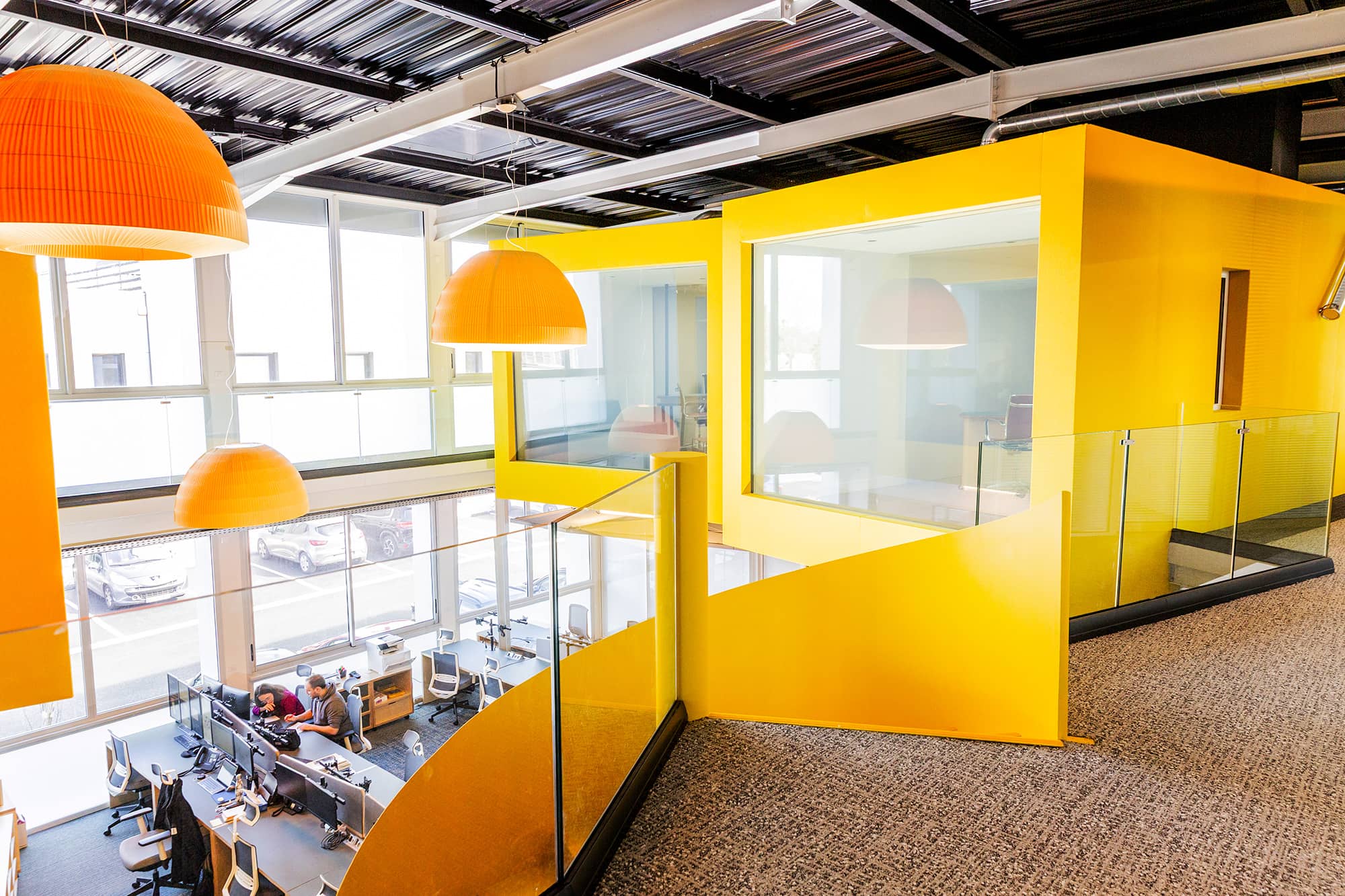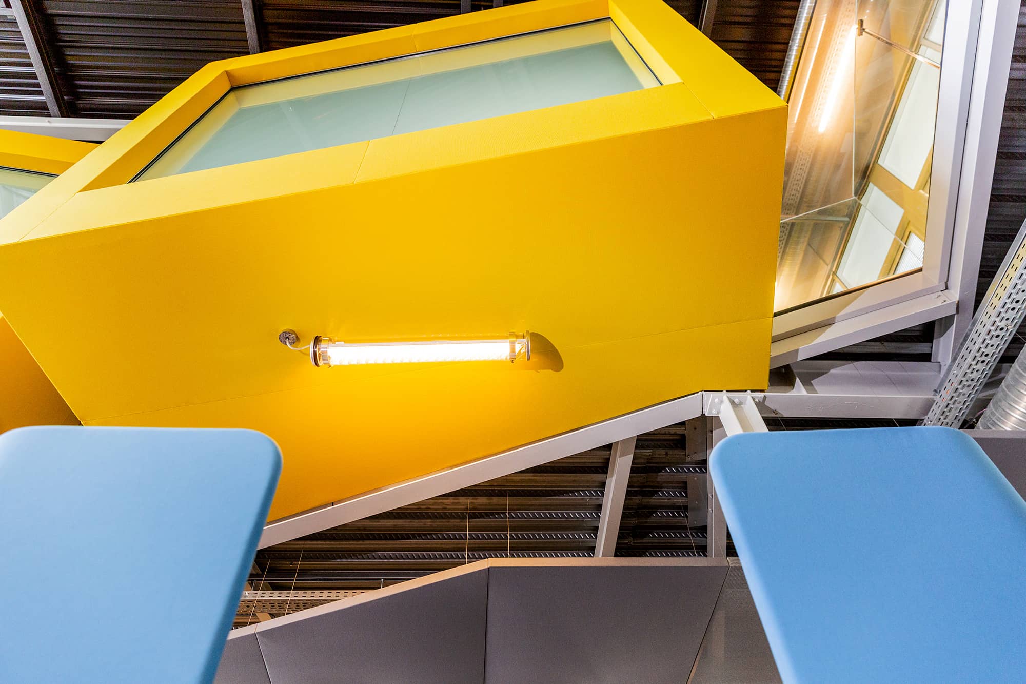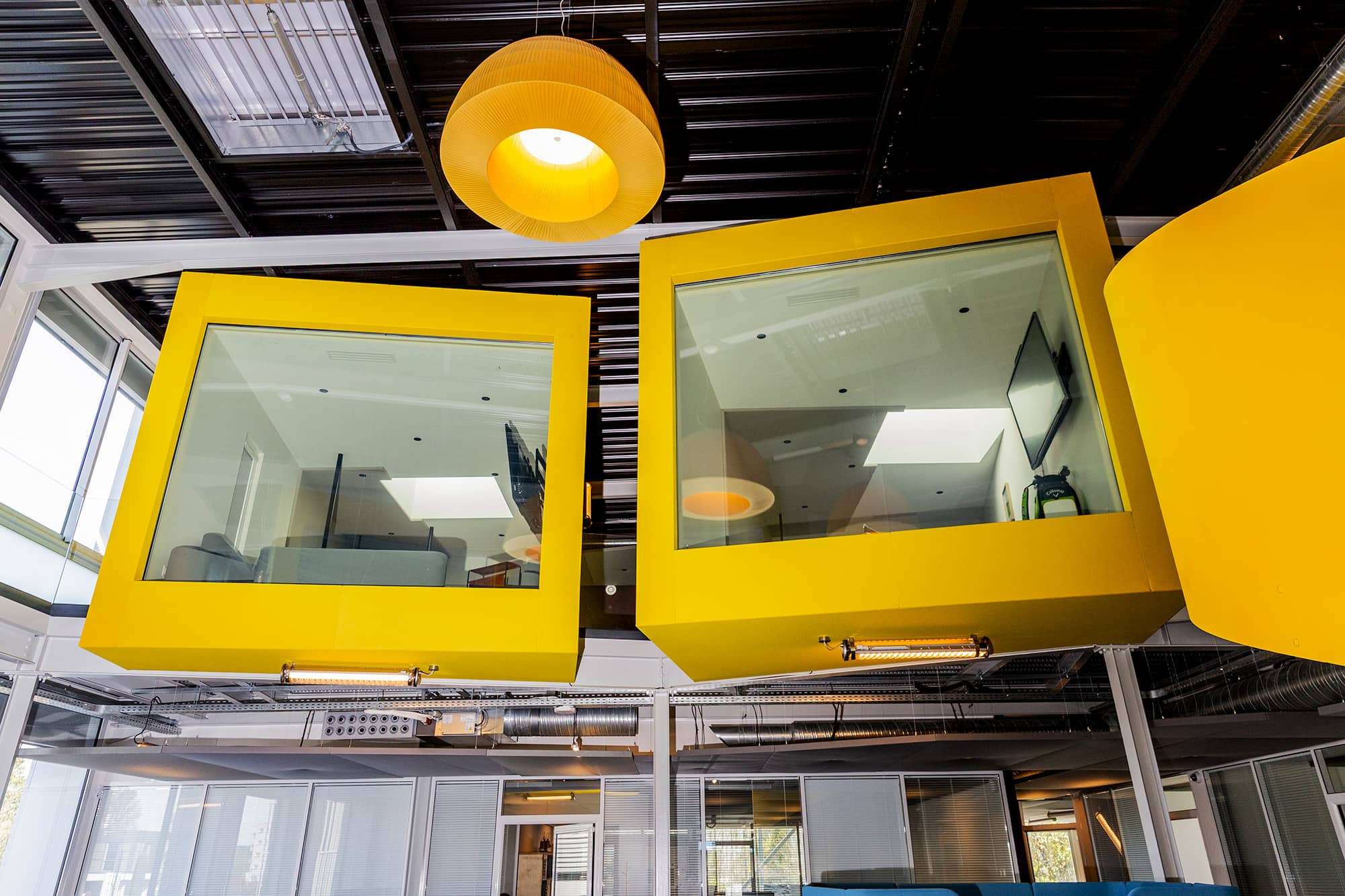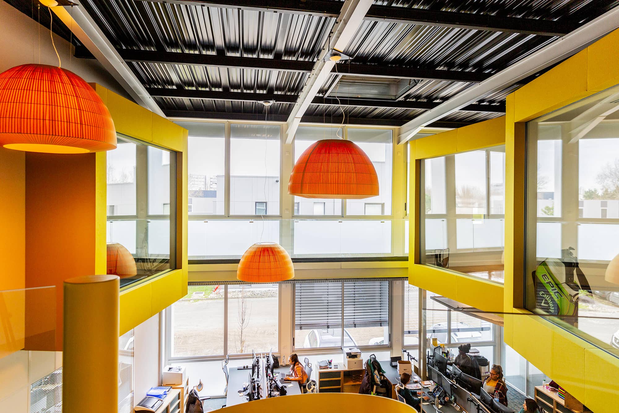 Le design se marie à la performance sonore autour de la pièce maîtresse des lieux. À savoir : trois bureaux vitrés suspendus en cube dans la boîte. Ils servent de régulateurs acoustiques flottants. Les cubes sont habillés d’un tissu acoustique Texaa sur les quatre faces afin d’absorber le son de tout l’open space. Pour un effet spectaculaire, l’architecte prend le parti d’aménager les bureaux de direction dans les cubes. Les lieux silencieux sont synonymes de bien-être et de confort. Le cocon industriel imaginé est dynamisé par des coloris pop comme le jaune des cubes ou le violet dans les circulations.