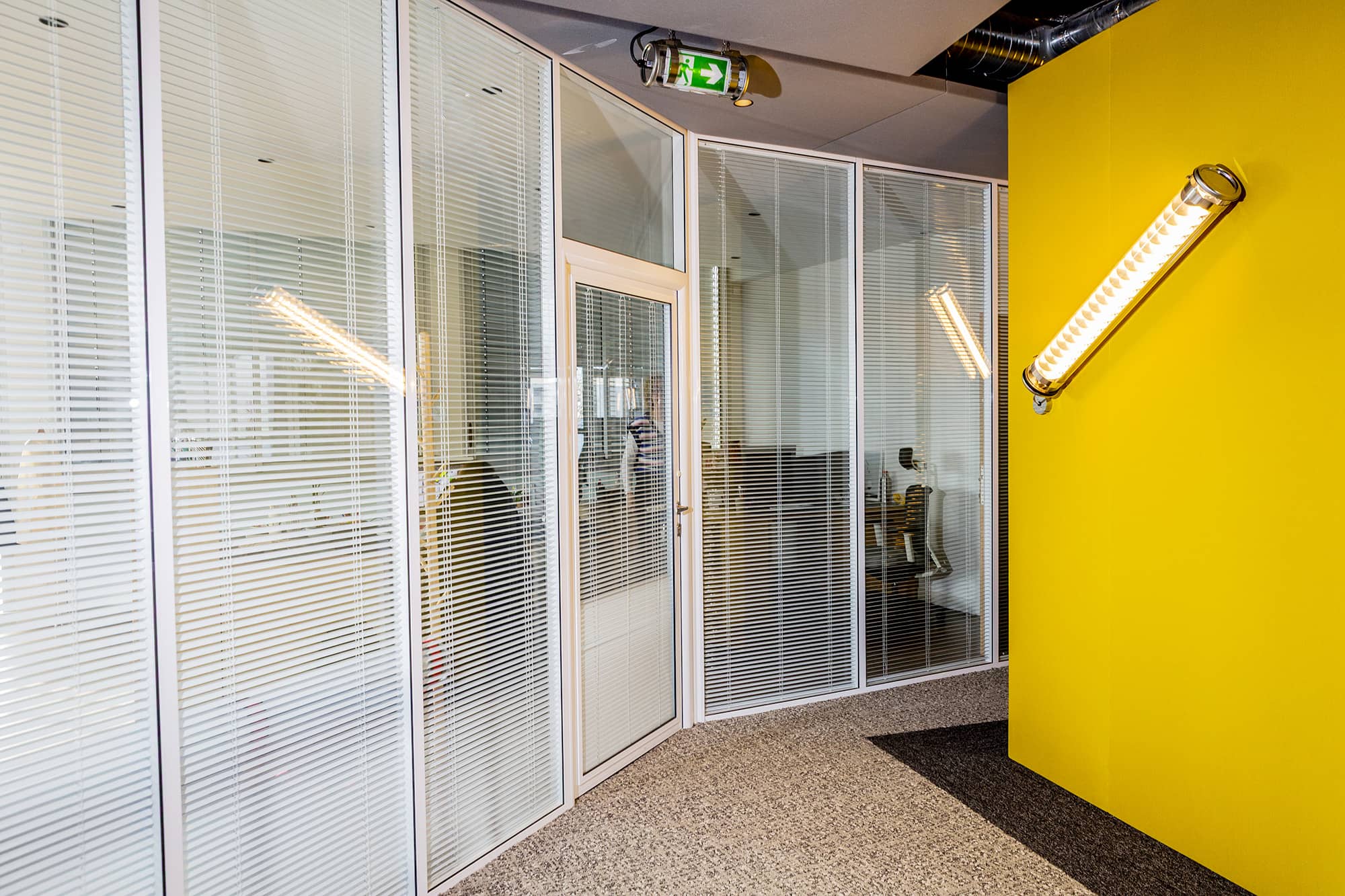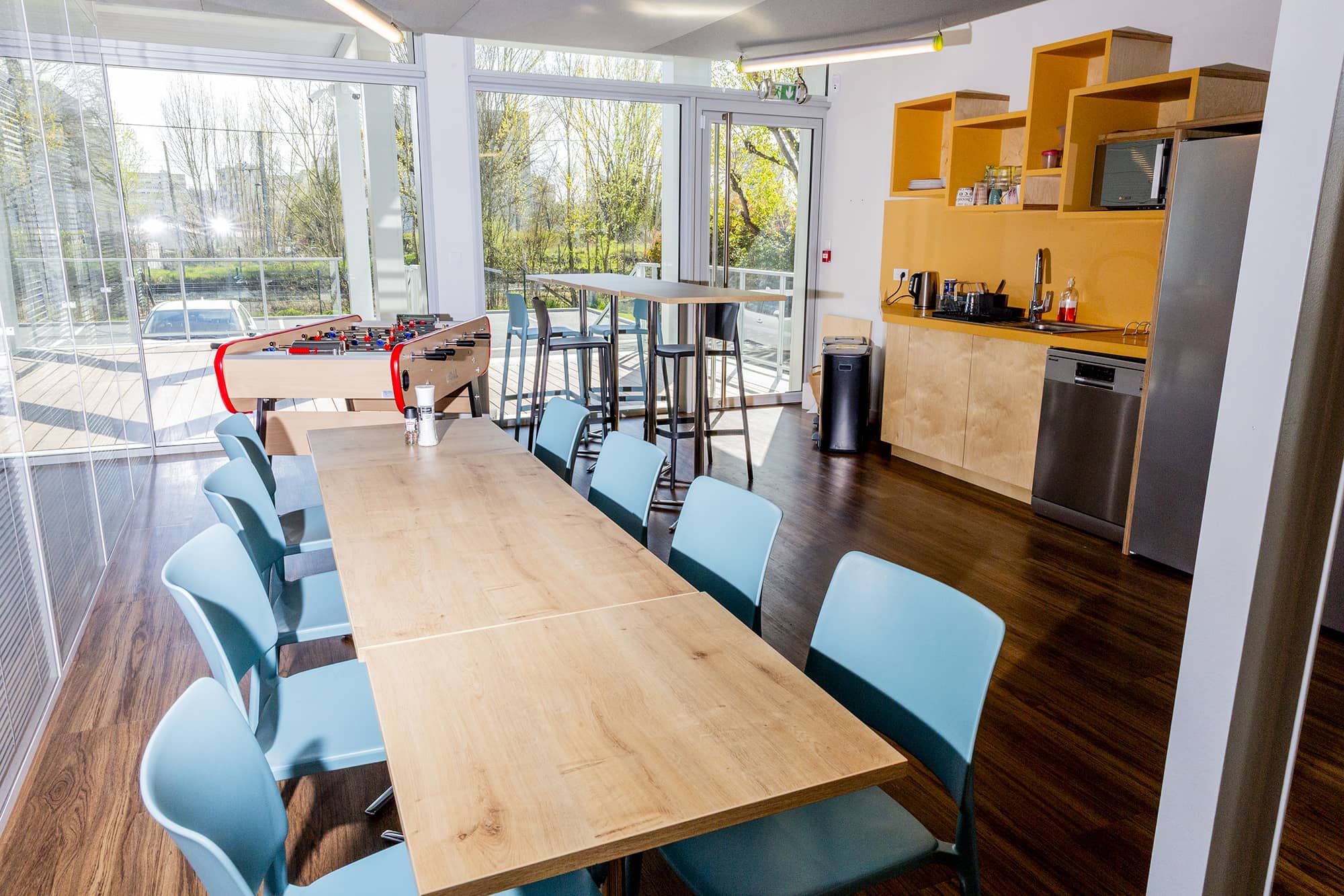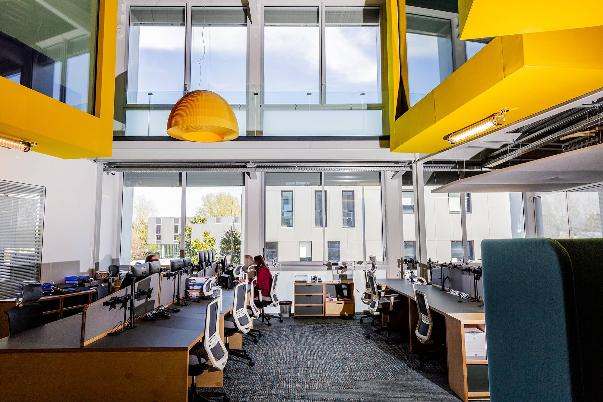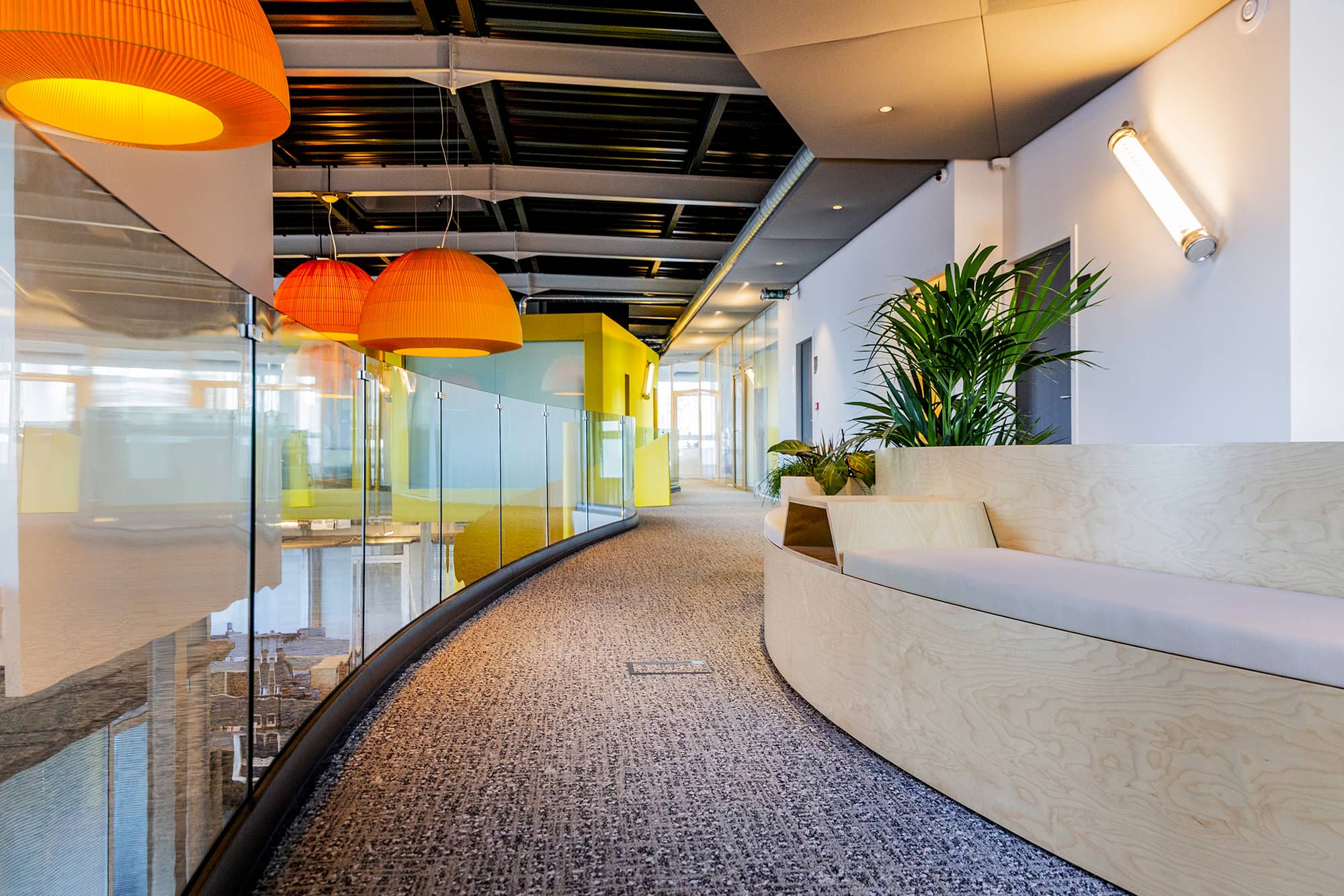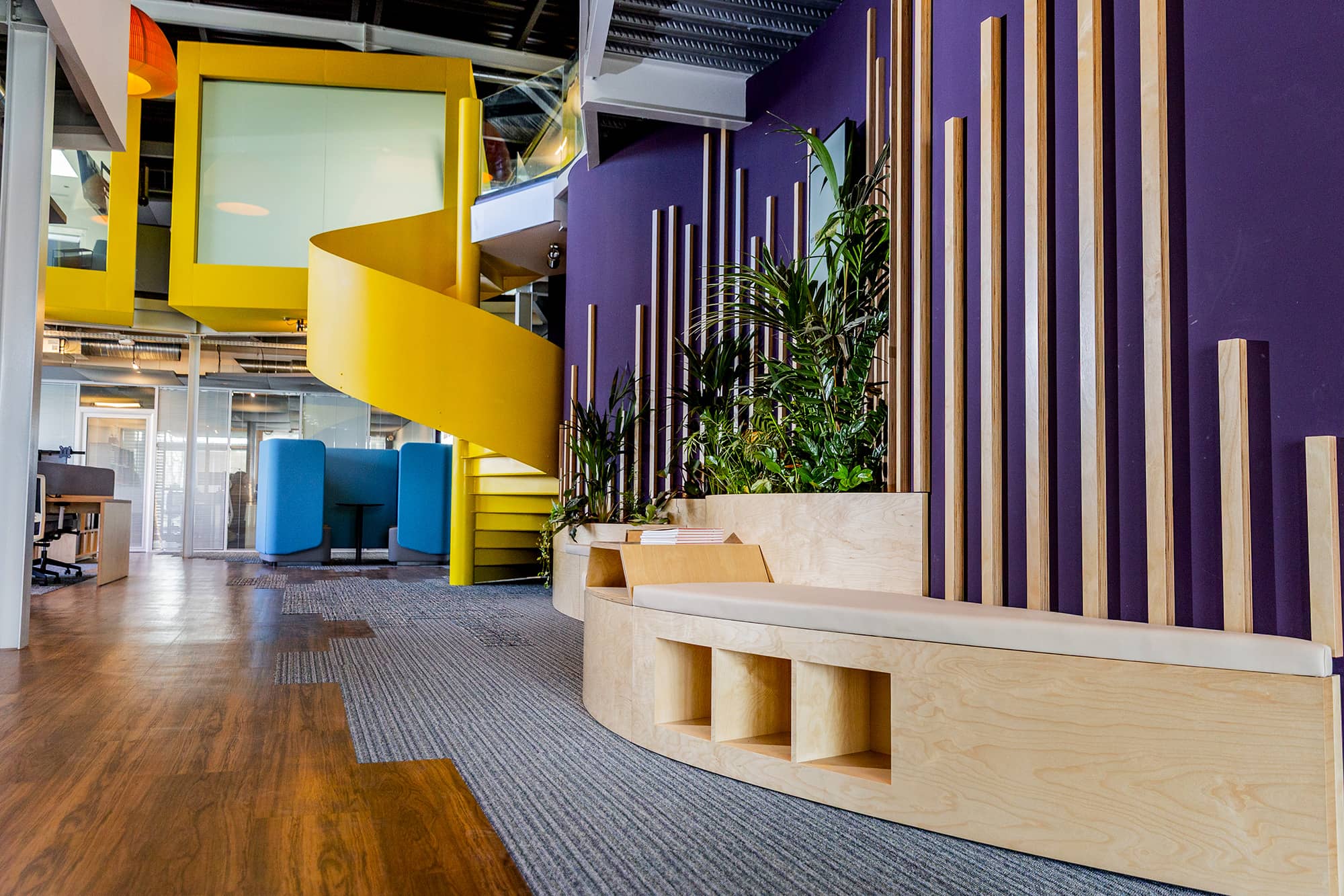 Le design se marie à la performance sonore autour de la pièce maîtresse des lieux. À savoir : trois bureaux vitrés suspendus en cube dans la boîte. Ils servent de régulateurs acoustiques flottants. Les cubes sont habillés d’un tissu acoustique Texaa sur les quatre faces afin d’absorber le son de tout l’open space. Pour un effet spectaculaire, l’architecte prend le parti d’aménager les bureaux de direction dans les cubes. Les lieux silencieux sont synonymes de bien-être et de confort. Le cocon industriel imaginé est dynamisé par des coloris pop comme le jaune des cubes ou le violet dans les circulations.
