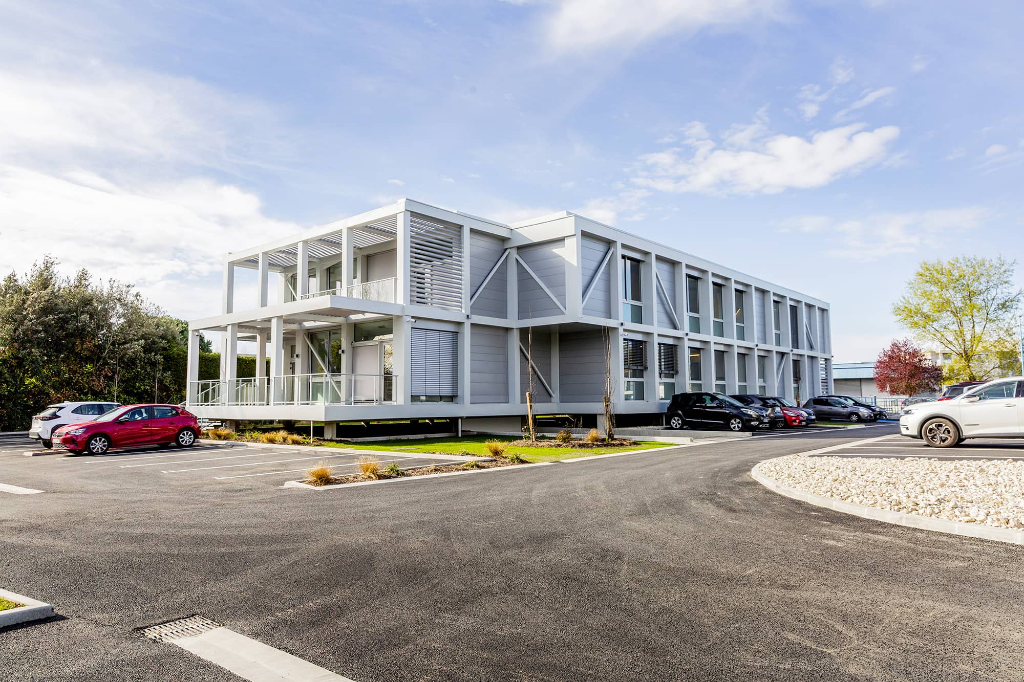 Le bâtiment bioclimatique vit avec le soleil. Installée dans une zone industrielle bordelaise, la structure métallique flottante est posée sur un socle maçonné semi-enterré. Son orientation à 360° permet de bénéficier d’une lumière naturelle maximale. La régulation climatique est automatisée via une station météo connectée. Des brise-soleil, pergolas, VMC double flux, une récupération des eaux de pluie renforcent la performance environnementale du site.