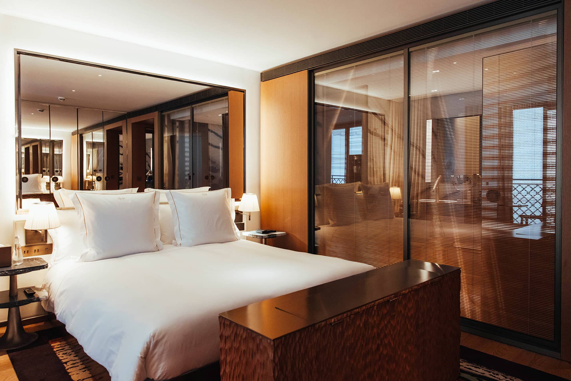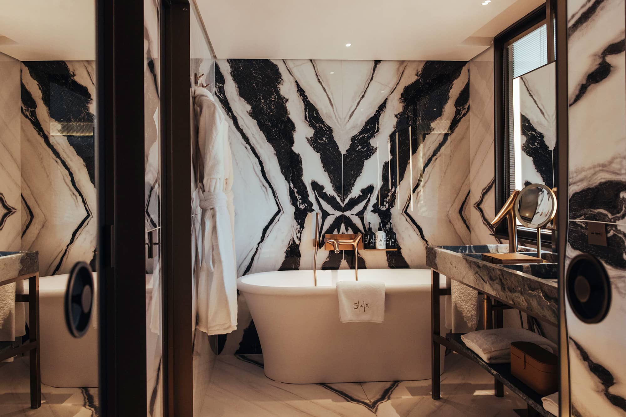 Les trois suites majeures, à savoir le Studio de 60 m2, la Winter Garden Suite de 45 m2 et la Signature Suite de 80 à 150 m2, sont décorées sur le même modèle. Elles possèdent un salon et lounge aux canapés en lin et matières naturelles. On retrouve dans chacune d’elle des lampes sculpturales en plâtre ou bronze, des coussins aux motifs ethniques, des tabourets en bois brûlé ou en chêne. Les salles de bains sont en noir et blanc. Dans un style plus intemporel et moins urbain, elles sont tapissées de marbre white panda avec des veinages noir et blanc. Les vasques sont taillées dans le marbre et les baignoires des suites sculptées dans la céramique blanche. La robinetterie dorée est moulée dans des formes organiques. Pour renforcer l’ambiance sereine et apaisante, une senteur maison de vanille parfume les lieux.