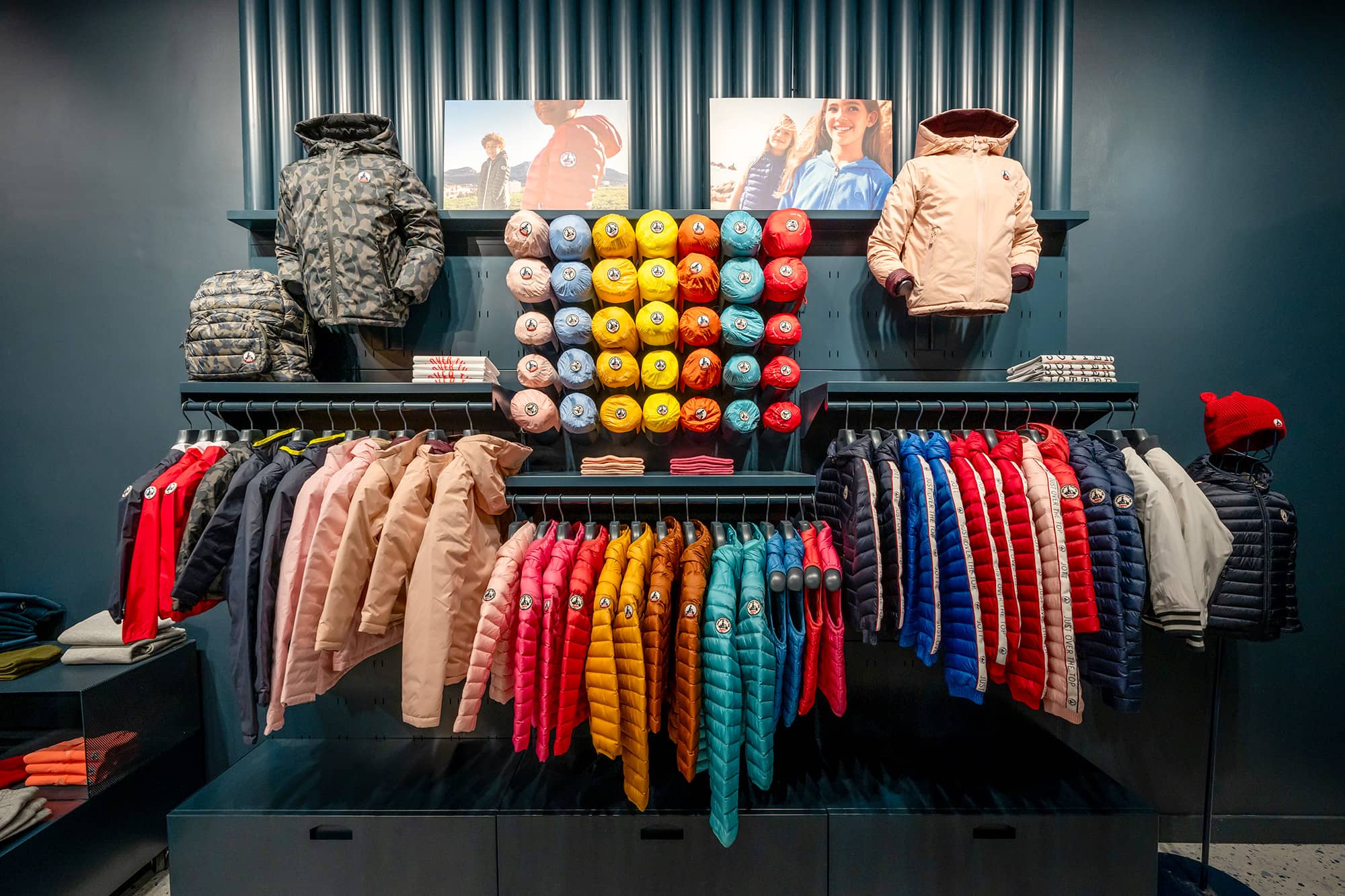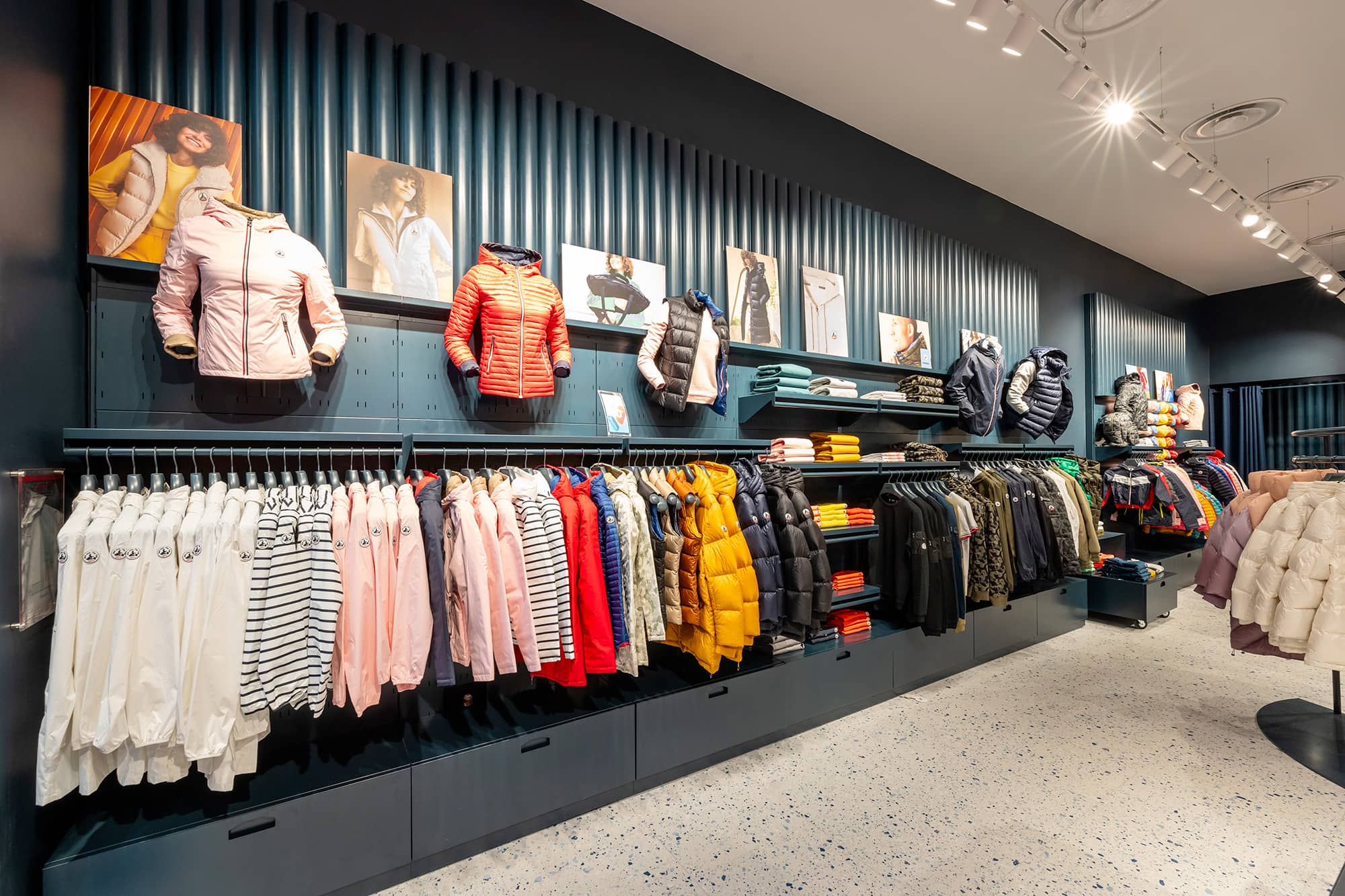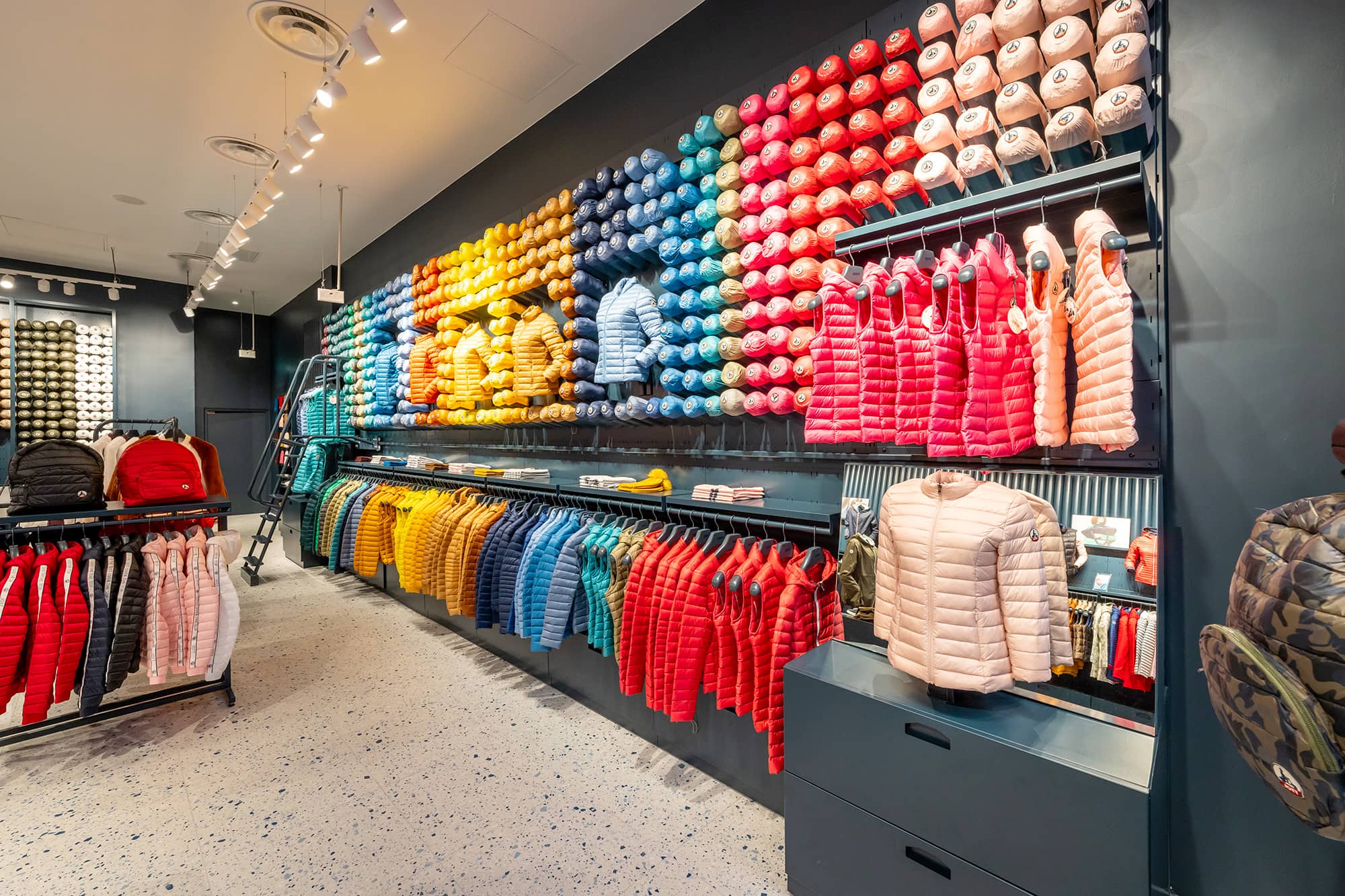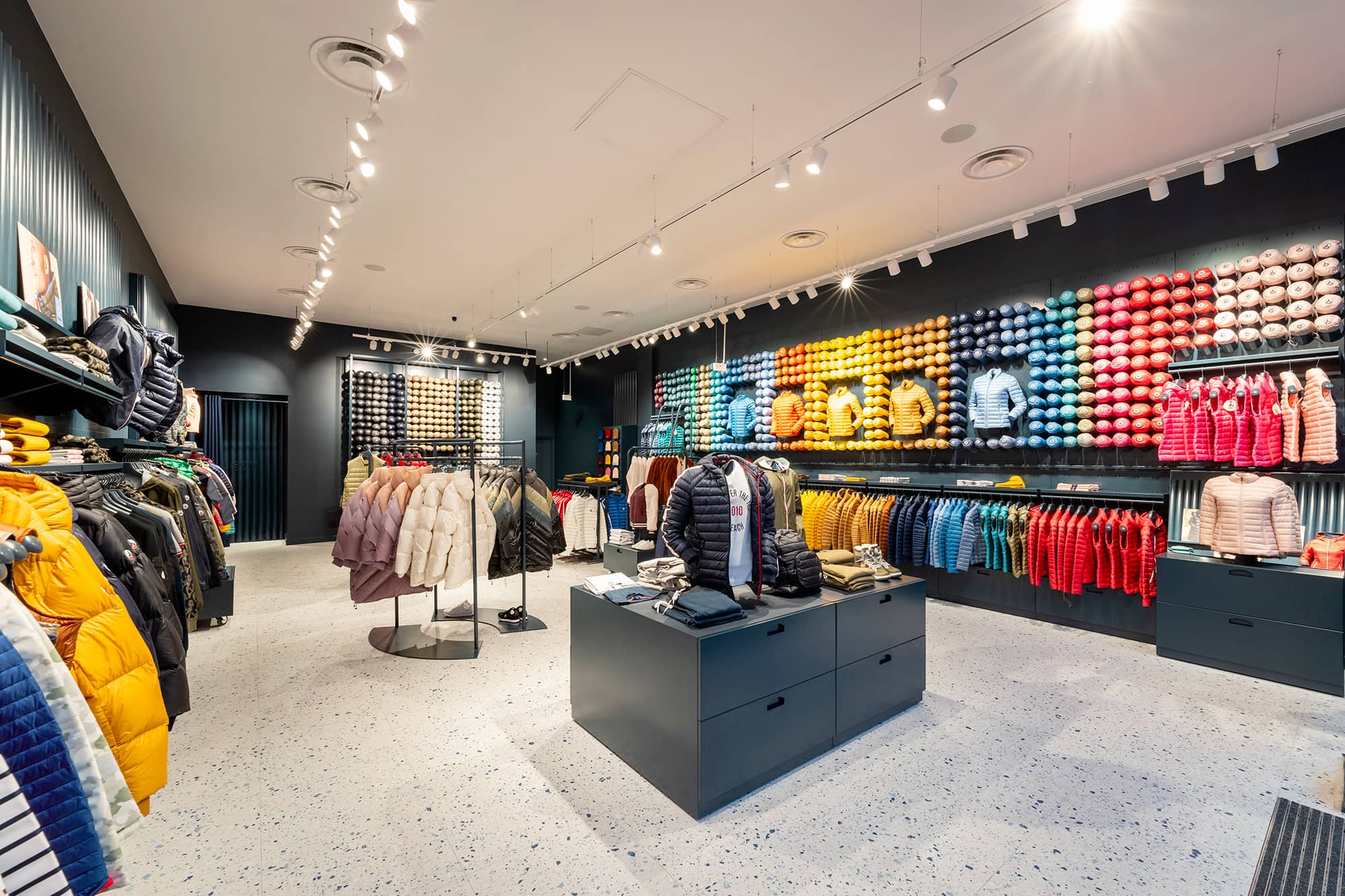 Les zones sont délimitées par du Flotex de teinte bleu profond. Il rythme le parcours client. Des services sont mis à disposition. Il est possible de vivre une expérience d’essayage hors cabines, d’échanger avec les équipes de JOTT pour de la broderie, de la seconde main ou toute autre demande. La pièce maîtresse des lieux reste toujours le mural de doudounes aux couleurs multiples et renouvelées selon les collections.