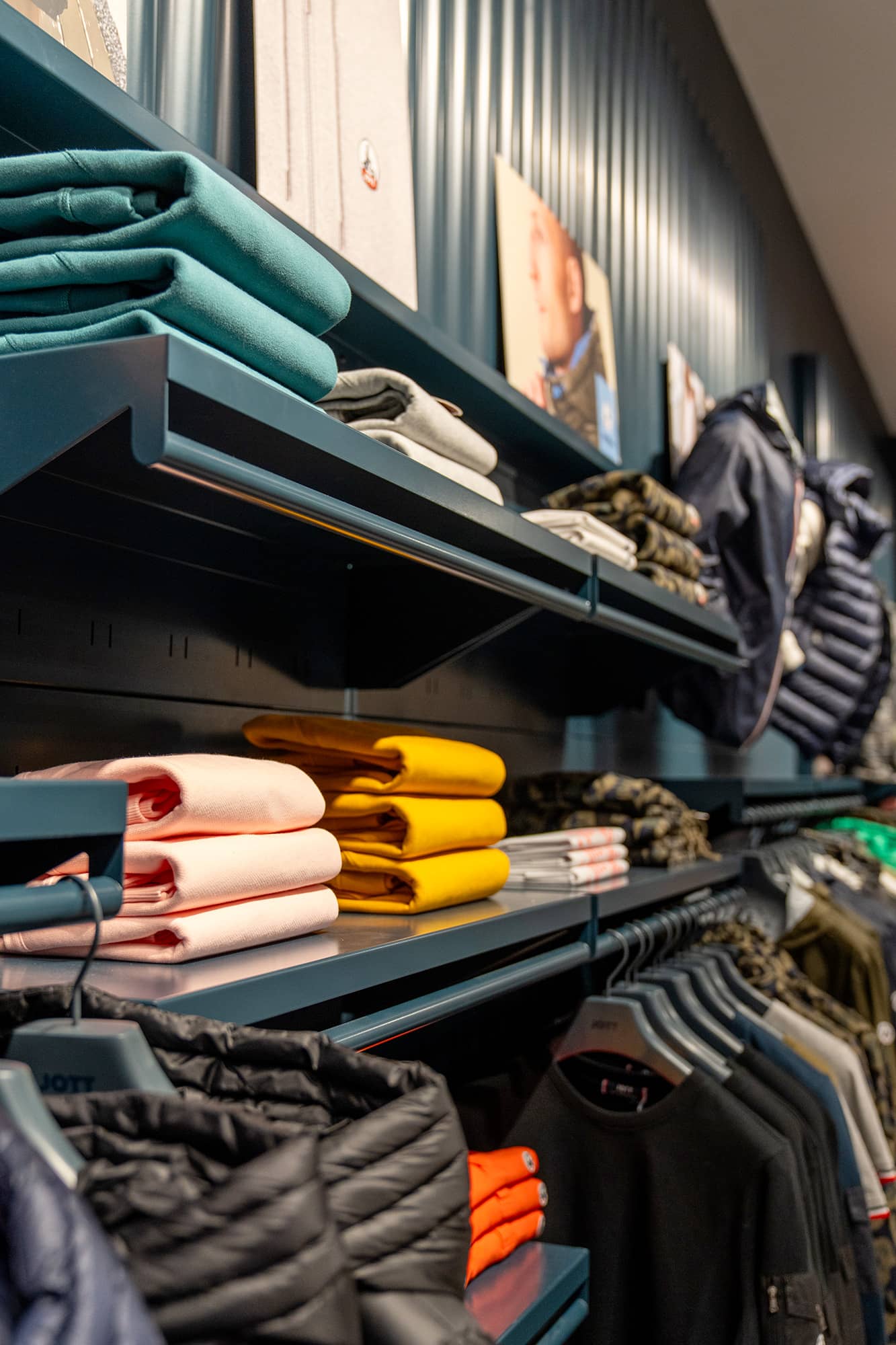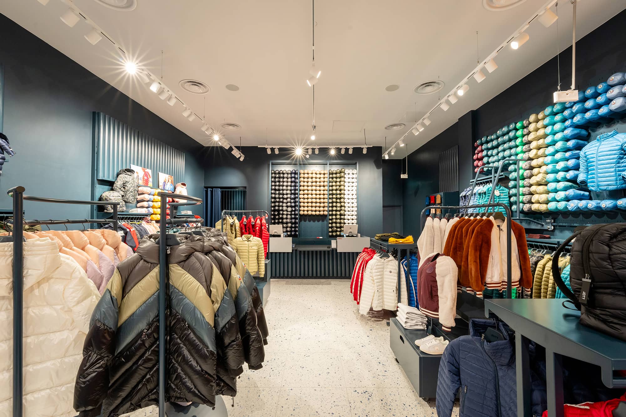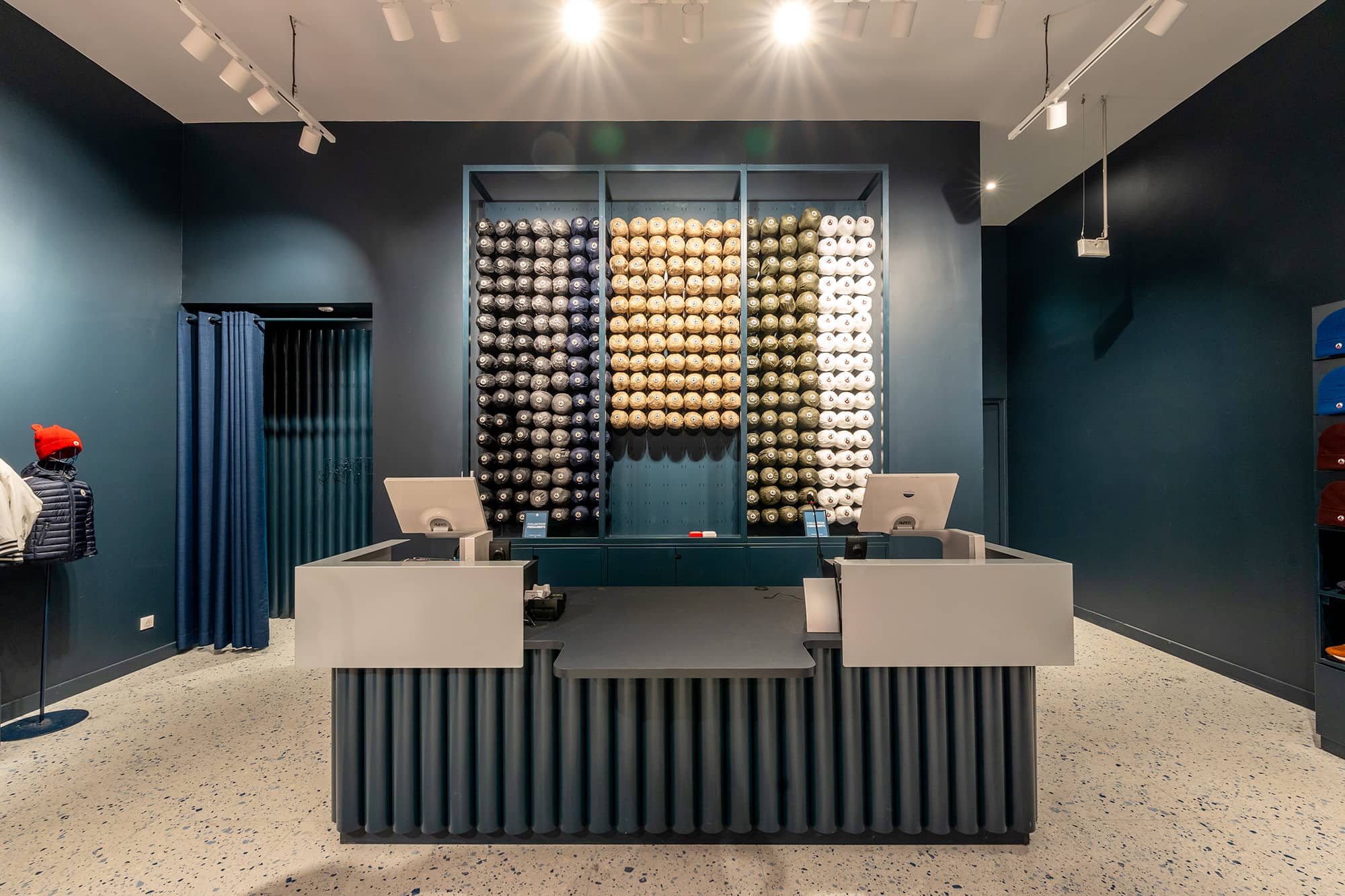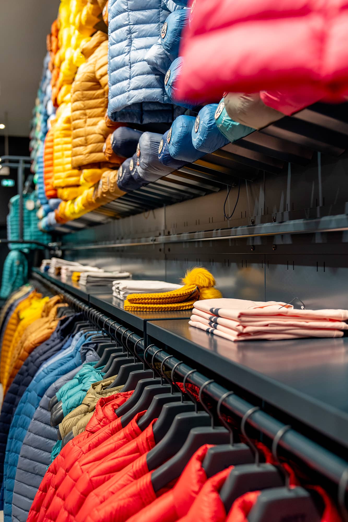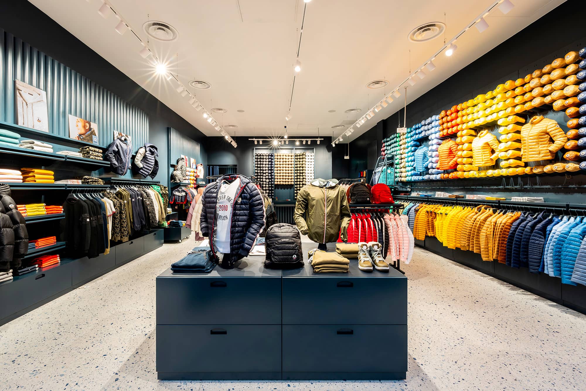 Les zones sont délimitées par du Flotex de teinte bleu profond. Il rythme le parcours client. Des services sont mis à disposition. Il est possible de vivre une expérience d’essayage hors cabines, d’échanger avec les équipes de JOTT pour de la broderie, de la seconde main ou toute autre demande. La pièce maîtresse des lieux reste toujours le mural de doudounes aux couleurs multiples et renouvelées selon les collections.